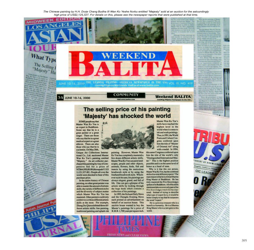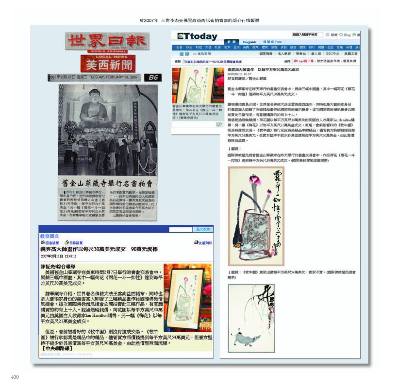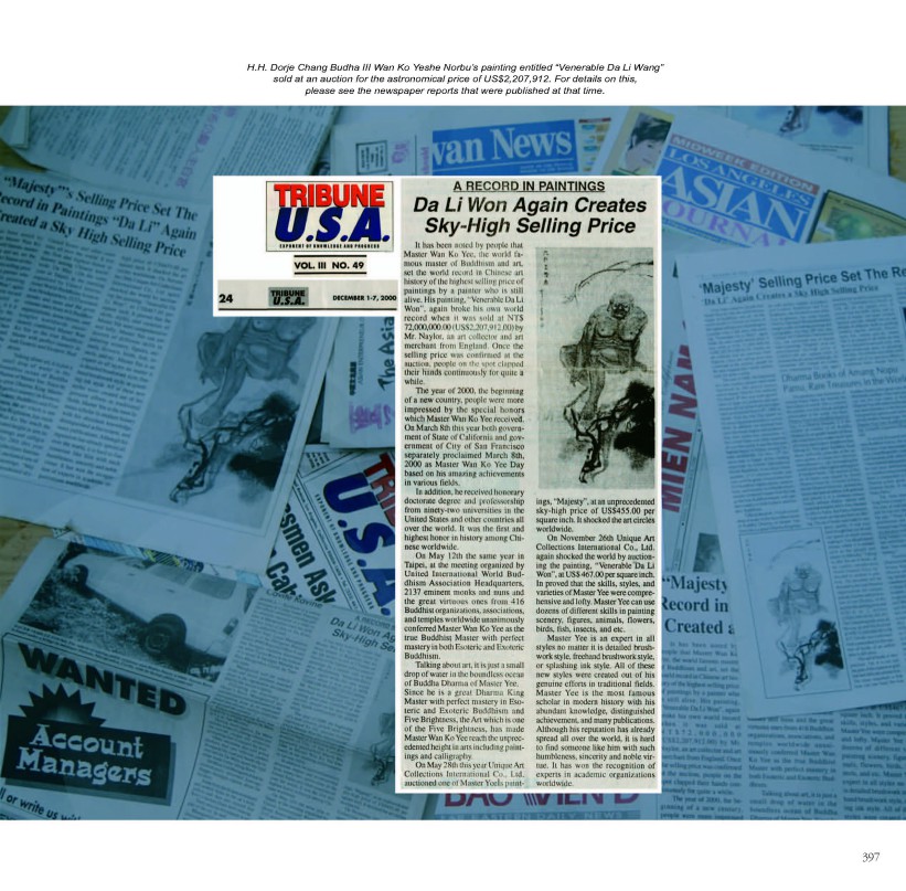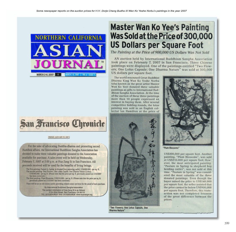 中國畫壇,人才濟濟,臥虎藏龍,給優秀的中華文化描繪出無數壯麗輝煌的畫卷,但歷代的名家大師們,他們的技法、風格和題材大都趨於單一,長於山水畫者,少精於花鳥,又疏於人物,如是等等,而多杰羌佛第三世雲高益西諾布頂聖如來的中國畫藝術,論題材,無論是山水、花鳥、走獸、魚蟲、人物……論技法,不管是工筆、寫意、潑墨……無所不通,無所不精,無一不是有真實的傳統功夫而創新的神意,這一點,早為評論家和收藏家們所肯定。西元2000年,三世多杰羌佛的繪畫原作「威震」和「大力王尊者」分別在國際拍賣市場上創下了美金二百一十二萬五千三百二十七元和美金二百二十萬七千九百一十二元的高價,當時不僅成為世界上所有在世畫家中作品價格最高的,也創下了中國畫在拍賣市場上最高價的記錄,各新聞媒體紛紛報導,稱讚三世多杰羌佛是真正的中國畫壇史無前例的巨匠。而在2007年,三世多杰羌佛的國畫荷花《兩花一斗一如性》,畫上只題有『雲高』二字簽名,蓋有指紋印、書畫印,以每平方英尺30萬美元成交。另一張梅花圖也只題款為『雲高』二字,蓋有一指紋印,售出價為每平方英尺21萬美元。而一張題有三世多杰羌佛雲高益西諾布並蓋有指紋印和法王印的《牧牛圖》,堪為稀世珍品,儘管買方出價到每平方英尺54萬美元,但仍低於國際佛教僧尼總會開出的每平方英尺九十萬美元的價格,因而未能出售。