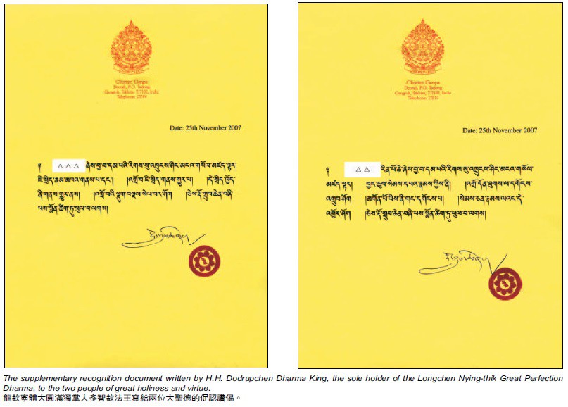 大圓滿龍欽寧體的多智欽大聖法王,這個世界上所有龍欽寧體的法都是他傳的,如佐欽、雪謙、噶陀、白玉等等若干寺廟的龍欽寧體法都是多智欽法王為他們灌頂傳法的,知名的如晉美彭措法王及其上師託嘎如意寶、仁增尼瑪雄獅法王、夏珠秋楊仁波且、第七世佐欽法王、龍洋仁波且、土登尼瑪仁波且、塔洛仁波且、仁增丹比尼瑪仁波且等都是他的弟子。簡單的說,凡是這個世界上所有龍欽寧體的法都是多智欽法王的法。多智欽法王在促認文中說這兩位大聖德:對××仁波且,出生在尊貴聖脈血統,如是促認:所有一切菩薩們慈悲眾生的行持,凡諸佛救度眾生的事業,你都能為眾生實現。對××× 仁波且,出生在尊貴聖脈血統,如是促認:只要有虛空存在,只要有眾生存在,就有你一起同在,滅除眾生的苦難。而遁世法王也在證文中寫道:『得見我上師多智欽大聖法王為××仁波且、××××××仁波且所確認題贈之頌詞,證明二位大聖菩薩確實是大怙主認證的。××仁波且生於尊貴聖脈血統,是釋伽炯乃大師之轉世,××××××仁波且生於尊貴聖脈血統,是大尊者舍利弗的轉世。為此我再次證實大怙主們的認證。確認出至高無上的法旨、正確無誤的。敬祝二位大聖菩薩與天同壽,度諸有情。』這兩位大聖德一是釋迦佛陀的名立第一的大弟子舍利弗仁者轉世,一是寧瑪巴創始人素布切.釋伽炯乃大祖師的轉世,可想而知,正因為尊者們達不到的證量而只有他們才圓滿展顯了,如果他們都不是H.H.的大法王,世界上就根本沒有H.H.的大法王可存在了。但是,明明通過印證考上獲得了H.H.的法王位而領到證書,但他們卻慚愧忍辱慈悲而居,不但不同意介紹證德證量和崇高大祖師的身份,而且連名字都不同意出現在書中,如此自謙的證德修行,實乃我們佛弟子珍貴的大聖楷模。