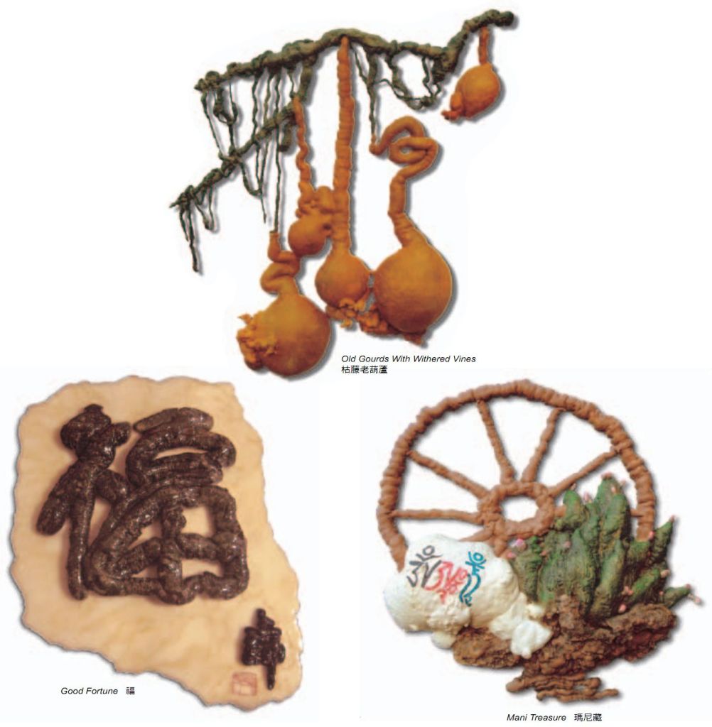 其中的「瑪尼藏」是體顯身語意三密之智慧力量,另一個「枯藤老葫蘆」是展現民族鄉土風情,樸實無華,高雅蒼俊的濃郁情趣。作品「家」這是代表著溫馨抒情,以翡翠清雅表達春意正濃,不老祥和之家。「地骨靈芝」體顯萬年古老靈芝化石,為文化風貌,內涵中西文化之神髓,世界和平之遺物。