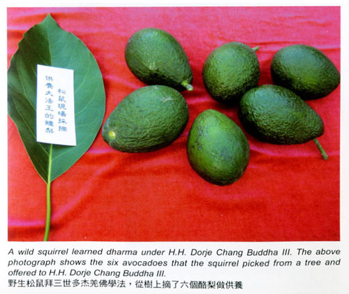 公元 二零零零年四月二十六日 下午,隆智(即丹瑪.翟芒尊者第二世--編者注,下同)與覺海陪同多杰羌佛第三世雲高益西諾布頂聖如來在居舍法壇妙游池邊,此時三世多杰羌佛指著一株酪梨樹(英文為:avocado)說:「這樹上的果我一直都想給大家嚐一下。」隨後,三世多杰羌佛命隆智去找一個摘水果的果鉤,結果找了一圈,空手而回,眼看著樹上的酪梨不能到手,此時三世多杰羌佛說:「我們一定要用這個酪梨。」話音剛落,從蒼古的青松樹上下來了一隻絳黃色的松鼠,三世多杰羌佛說:「你們不要趕牠,牠來幫忙的。」這時松鼠在樹上開始查找酪梨,由於酪梨類似於樹葉的形體色彩,松鼠施展多種技能,包括飛騰、懸勾、倒掛,將稀少的酪梨從綠色的樹葉中一個個分辨出來,然後一個個摘下來,不到十分鐘,摘到第六個時,佛陀上師說已經夠了,隆智傳話說:「松鼠!你辛苦了!你的供養功德無量,不要再摘了。」松鼠聽聞後,趴在橫枝上,兩眼盯住三世多杰羌佛,將前掌合掌恭敬,一動不動。此六個酪梨即是松鼠當時摘下來的供養三世多杰羌佛的供品。