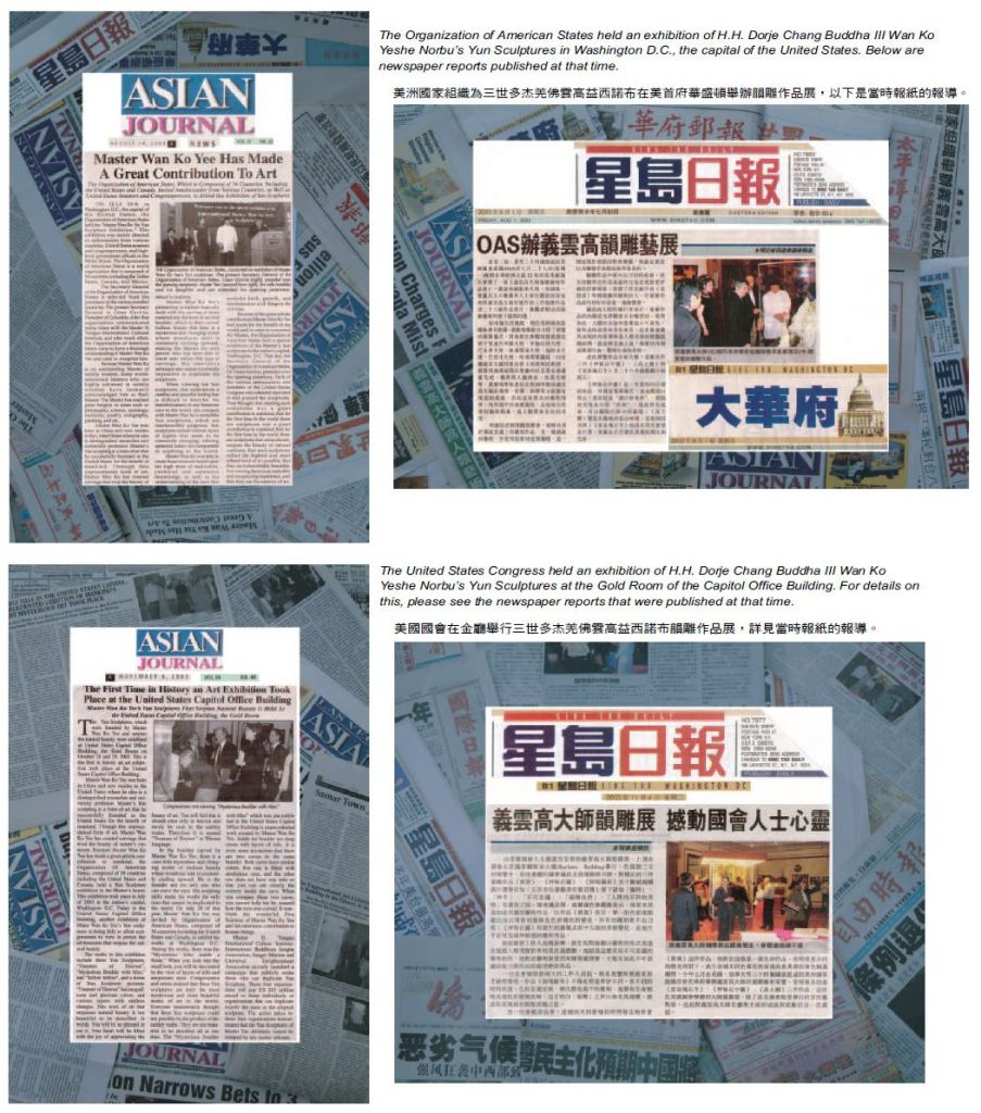 正因為頂聖如來雲高益西諾布的藝術作品超越了人類藝術的高度範疇,達到了自然化的神工境界,所以由美國、加拿大、墨西哥等34個國家組成的美洲國家組織,於2003年專門在美國首府華盛頓,針對各國大使及美國參眾議員為主要觀賞而主辦的藝術作品展,震動了世界。議員和外交大使們都認為三世多杰羌為世界人類作出了巨大的藝術貢獻,尤其是美國國會於2003年10月28日、29日,在國會辦公大樓的金廳舉辦三世多杰羌佛的韻雕藝術展,這是美國國會二百多年來首次舉辦的藝術展,以參眾議員和國會工作人員為主體,參觀人潮絡繹不絕,有近四百人主動在留言簿上寫下了真誠的讚譽,達到眾所公認,驚嘆的程度,可惜書本上無法展示出其真實的效果,以後有機會可到展覽館參觀。