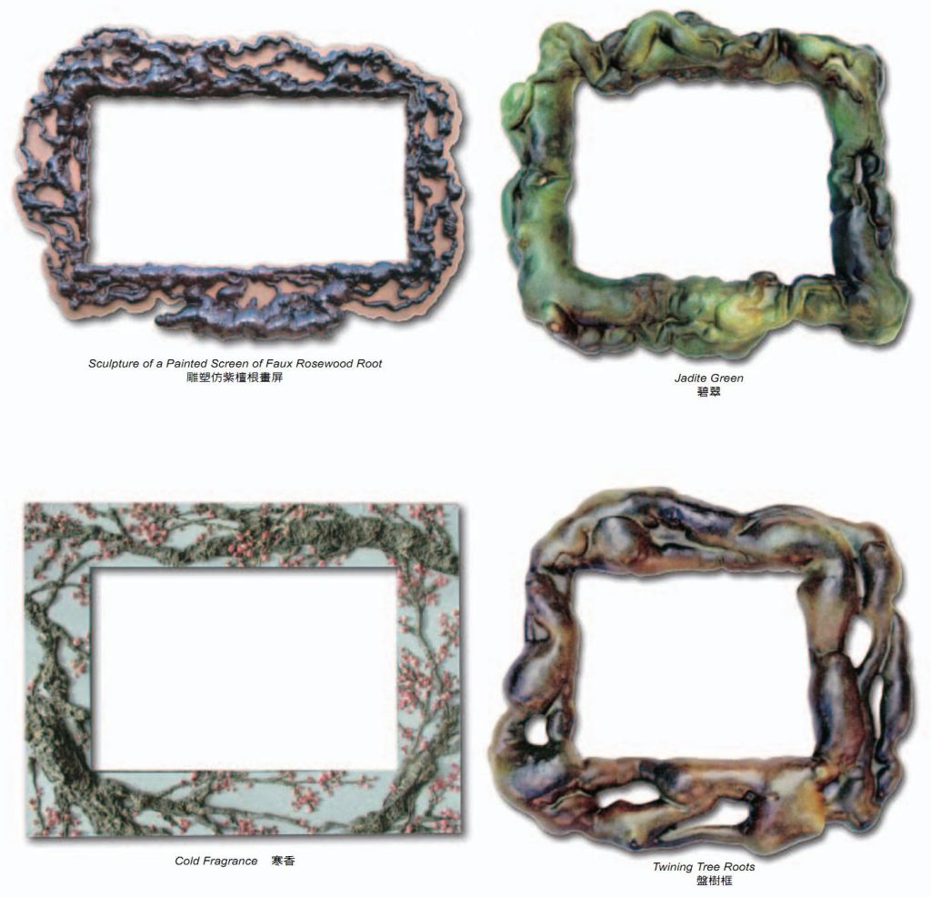 歷史上從古至今,畫框的種類非常多,有巴洛克式的,有樹皮的,有線條式的,有中式雕花,鍍金上銀等等,但卻沒有從大自然取材的,為此,多杰羌佛第三世雲高益西諾布頂聖如來為了改變這個地球上的畫框框藝,讓人們享受到與自然相合的藝術沐浴,他創始了取大自然素材為體的塑材框藝,如靈芝蕈類、熱帶植物盤樹類、珊瑚自然結構類、出土文物古化類、羊脂翡翠玉雕類、藤蘿盤匝類,最關鍵的是三世多杰羌佛以智慧和內明的力量,將它們施以地水火風四大無常的內力,把它們誕生成天然造化而成的結構,看上去比真的還要真,比自然的還自然,此舉二例,如靈芝畫框、翡翠畫框。靈芝畫框即是以靈芝蕈為組合的畫框。此靈芝蕈不是真實的蕈靈芝,而是人工雕塑刀工色染而成的靈芝蕈。此靈芝蕈隨其木板畫框形體而連接一氣造成,達成精妙結構之整體,與真靈芝蕈色澤、韻味、形體相等。而更甚之處是有千年稀芝、百年老芝、近新嫩芝,相互結體,達成雅韻。其芝菇與芝杆相互穿流,宛如平沙落雁,沙飛毛交,茫然若霧,渾然而影顯,若沉若浮,虛實飄逸,霎那間雁定雄姿,灰隨風卷,殘塵嫣然不知所向,萬里空清,白雲飛絮。此際,雁姿嬌然,何其雄風展秀,正是韻雕之風神韻所在。而芝風色蘊形味變化奇端,麗、秀、蒼、古、殘、破、斑、奇、雅、雄、潑、渾,具十二味境。麗者,華麗攝心;秀者,俊俏秀氣;蒼者,老道蒼勁;古者,嚴古稀恆;殘者,殘缺天然;破者,風霜蟲破;斑者,斑跡如真;奇者,珍奇稀物;雅者,雅純高貴;雄者,雄奇霸道;潑者,潑辣大方;渾者,渾厚華滋。此十二味境,是韻雕靈芝鑑別真偽,乃三世多杰羌佛工雕之絕活所在。