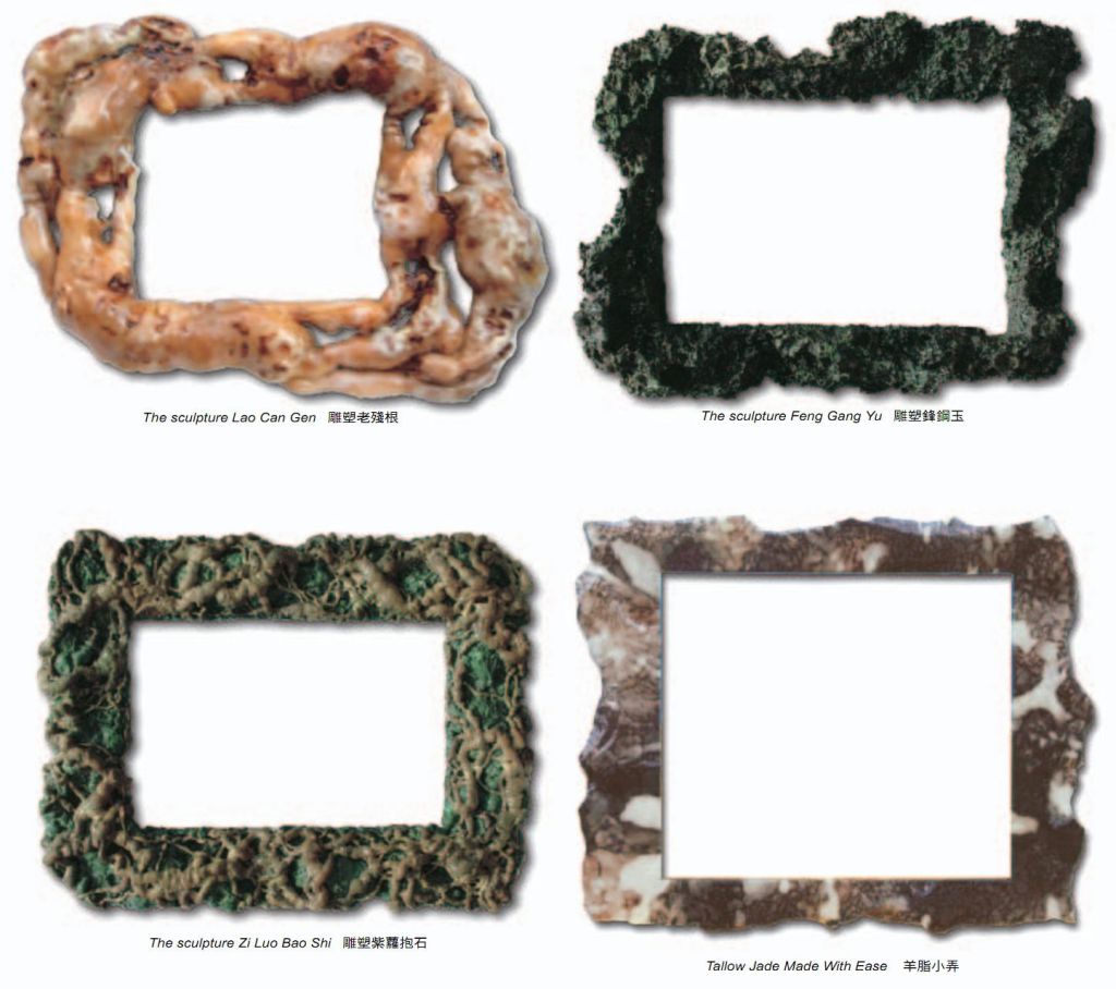 其實,以上所講到的翡翠畫框的幾種奇絕特質,並不只在此處才有,三世多杰羌佛的所有韻雕畫框都是這樣,以色韻、雕工達到絕對逼真於天然山石或植物的質感,但又絕對超越天然達到極致的完美。如三世多杰羌佛雕的枯藤、樹根、羊脂玉、老木、獸斑玉、靈芝、紅珊瑚等等等等,每一個的任何細部的表達都絕對真實天然,形神具備,但又脫去了天然物體受風霜雨雪的侵害而遺留的黯淡殘缺,將這些自然寶物在生長過程中偶爾短暫或並不強烈綻放的美好,發揮到完美的藝術極點。說一句毫不誇張的話:老天爺若看到三世多杰羌佛的韻雕畫框,會汗顏!
