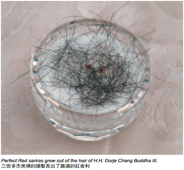 還記得是在2003年6月1日這一天,我將一些尚未打開的紙包拿出來整理,想將頭髮洗一洗,因為頭髮很細,我特別用過濾網裝起,浸在水裏,就看到有三顆圓潤的紅色小珠子在其間,因所有過程是我自己經手,沒有碰觸過任何其他物件,我深感奇怪,哪裡跑來的紅珠子?想用手指按按看,這小珠子是軟的還是硬的?還拿了一個放大鏡仔細來瞧瞧,忽然腦中一念,這會不會是舍利?我這樣做就太不恭敬了!趕緊將那三顆小珠子,裝在一個白色的小盒子內,拿去請示三世多杰羌佛:「請問這是什麼東西?」佛陀上師說:「妳從哪裡得來的?這個是舍利啊!」然後修法持咒,確定這是真正的舍利,我稟告佛陀上師,這是包在紙內,佛陀上師剪下的頭髮中出現的,之後,佛陀上師特別開示:「這應該說是眾生的福報和因緣,無論是怎麼來的,或是佛菩薩加持的也好,同學們怎麼想其實都不重要,它會無中生有來,就會無中生有去,重要的是我們每一個人自我的修行問題,要依教合法。」當晚,我小心翼翼地將這三顆紅色的舍利,裝在一個蓋的很緊密的西藏小盒內,上面墊了一些白棉花。第二天,有位同學 想請去看看,我想把舍利換裝在一個新買的水晶瓶內,當我打開小盒子一看,怎麼只有兩顆呢?我沒有再觸碰過任何其他物件啊!棉花被我一絲絲地撕開、撕爛,就是只看到兩顆,真令人懊惱!它印證了三世多杰羌佛先前所言:「它會無中生有而來,無中生有而去!」我也曾聽過一位師姐親見過佛陀上師的身上掉下舍利,這次自己能夠親眼見到,真是無限殊勝祥瑞。