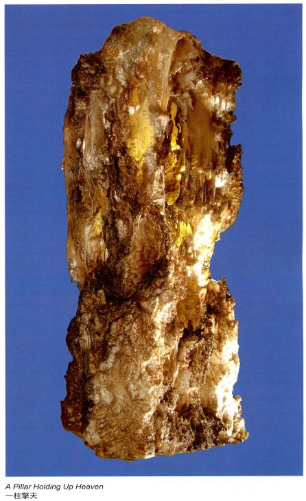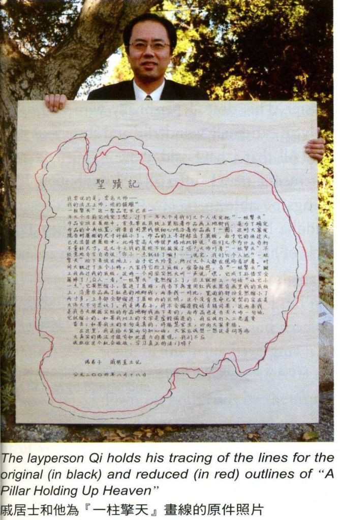我要說的是,雲高大師(即多杰羌佛第三世雲高益西諾布頂聖如來──編者注,下同)──我的佛陀法王上師,他的韻雕『一柱擎天』這一聖品藝術已在一年九個月前完成定了型,過了一年九個月我們幾個人決定把『一柱擎天』作品安放在展櫃中,首先要在底板上緊貼著作品劃上地腳線,是為了確定作品的中央位置,我親自用黑線很細心的沿著作品畫了一圈,這時大家發現當時展櫃的尺寸計算小了,作品的上半部超出了底板,由於它的體過大,已無法裝進展櫃中,此時雲高大師很嚴格地批評說:『你們幾個為什麼當初不量好尺寸,這幾千元錢的展櫃不就報廢了嗎?』大師對著『一柱擎天』不經意地自言自語說:『你小一點就好了嘛!……』說完,我們六個人把『一柱擎天』抬下來放在地上,由於它太珍貴,所以幾個人都在現場看護著。時間大概過了五個小時,大家將它抬上底板,準備拍照,當『一柱擎天』搬上我畫過線的底板,這時一個同學突然大叫一聲說:『嘿,它成了孫悟空的金箍棒了!』眾人一看,『一柱擎天』竟然縮小了,佛陀法王就那麼一句話『讓它小一點』,它果然縮小,裝進了展櫃。我當下再度用紅線在原有劃黑線的底板上,沿著作品畫了紅色的地腳線,兩條線一對比,寬面的部分竟然縮小了兩寸多,上半部全部縮進了展櫃內的區域,這個沒有生命、已定型的作品實在是太偉大不可思議了。我是佛弟子,我不會編造假話去錯因果,這兩條線是我當天根據實際的作品地腳線畫下來的,而作品也是當天大師一句話,它就縮小的。如果我以上的文字是虛假編造的,我應該打入三惡道變畜牲,如果我立的文句是真的,將福慧宏生,回向大家幸福。