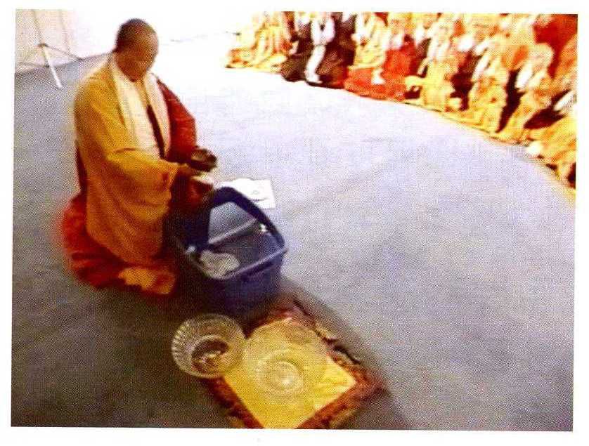 又修了三個月,正逢因緣和合,請到了萬人高僧法王仁波且們的火供法章,為選擇洗甘露法缽的人,佛陀恩師開始選擇人選,當時從台灣和美國二十多位老修行中選拔,其中有仁波且、大法師,美國有我和邢格西,及西瑪仁波且三位列席,最後,萬萬沒想到,我這位慚愧比丘尼被選上執持修法。壇城沐浴開光後,我們首先恭迎佛陀恩師陞座,當時我身心斗變,加持力甚大,我知道,佛陀恩師今天一定會請來佛陀降甘露,但也有些擔心,因為佛陀恩師在修法前對我說,這求佛降甘露,他確實沒有把握,如果沒有求到,這是因緣不夠,希望我理解,但是不管怎樣也要好好學佛,利益眾生。我聽了佛陀恩師的一席話,感到非常慚愧,在法會中我如法依儀軌洗缽,所有人員的誦咒把整個壇場宣成一片梵音,吉祥無比,燃燒萬眾僧火供功德法章以後,天空和壇場殊勝無比,法師們見到天空出現了動態的佛陀和觀音菩薩,這一次佛陀降下甘露了,在紫金銅法缽中跳動,眾僧和居士們在現場見到,個個激動,發心要好好修行,利益大眾。這一偉大的佛法聖蹟,新聞記者在中英文媒體報導了現場實況。今天回想起來,這些在場的人他們發心感人,但他們真正悟了什麼叫修行嗎?其實很多人都沒有悟到,沒有!跟我當初一樣,雖然作了住持,但修行有缺,也未能做到。我們都應該把佛陀恩師的《正法寶典》認認真真看,真正以三業相應去修持,如實落實佛陀恩師為我們傳的修行法,才會得到成就!