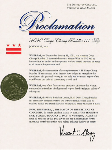 「第三世多杰羌佛日」是目前全球唯一由政府頒布的佛陀日,是由美國首都華盛頓市葛瑞市長在2011年1月19日所頒布,葛瑞市長號召大家向H.H.第三世多杰羌佛致敬,表彰第三世多杰羌佛在佛教界崇高的地位與宣揚和平的卓越成就,同時也宣告了佛陀住世的佳音。當年葛瑞市長致辭時說到:「H.H.第三世多杰羌佛以無私和卓越的努力,向祂所接觸到的人們宣揚和平的精神;以祂的智慧、才華和道德本質,大悲、無所求報地來幫助那些最需要治癒的人們;祂生命中所得到的巨大成就,對強化我們社會和平的基礎做出了偉大的貢獻。」揭示佛陀宣揚慈悲救世,利益他人的宗旨。