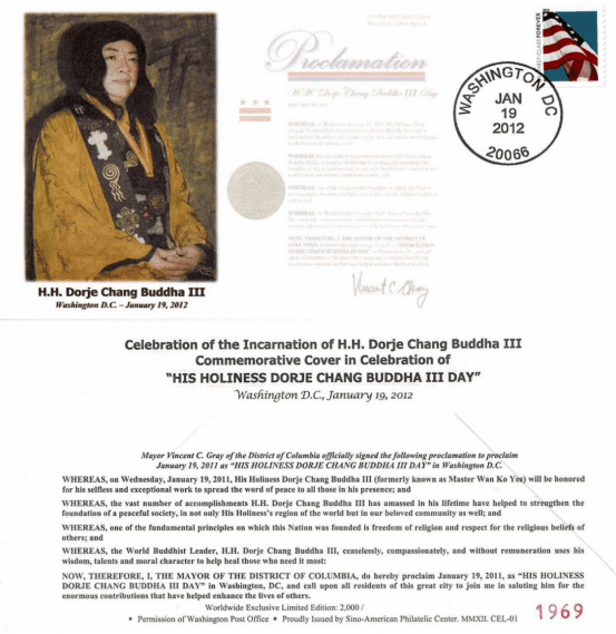 2012年1月19日,中美集郵中心舉行發布會,宣佈發行全球限量2000套的「H.H.第三世多杰羌佛日」紀念首日封以此慶祝「H.H.第三世多杰羌佛日」一周年紀念日,這是美國郵政史上第一次以佛陀名義發行首日封。