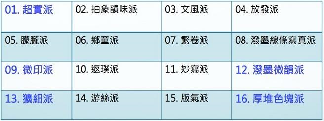 H.H.第三世多杰羌佛十六畫派 (藍字為現場有展出「代表作品」的畫派)。