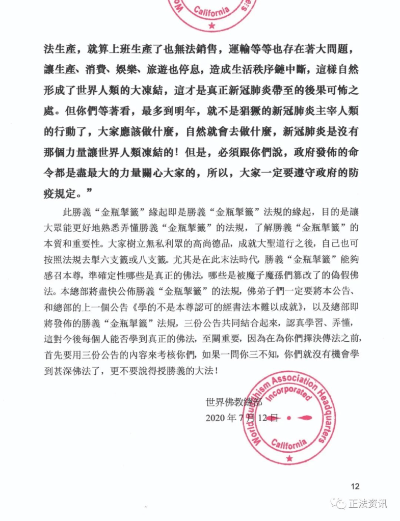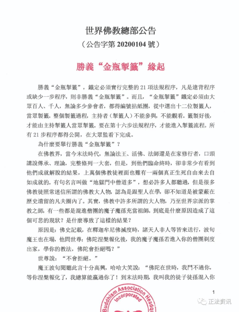世界佛教總部公告(公告字第20200104號)- 勝義“金瓶掣籤”緣起