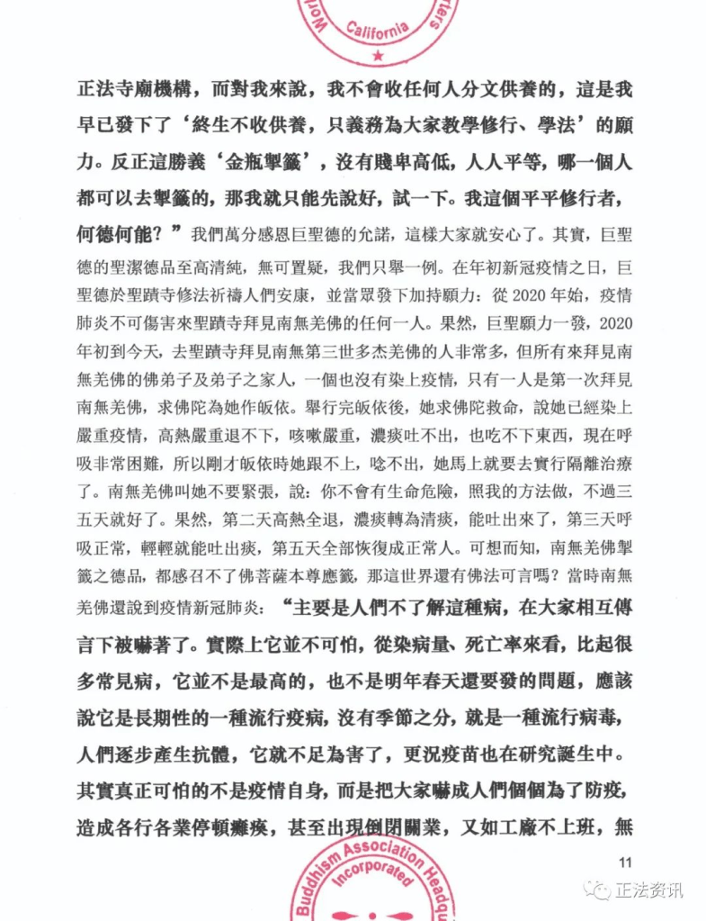 本總部上尊和能現量伏藏的玉尊都分別用十支籤、八支籤擇了兩輪,但還欠德能,目前沒有成功,就看再降掣六支籤,能不能成功。只不過現在要公佈一條特大福音,我們聖德組再三請求巨聖德出面,為眾生學正法掣籤,巨聖一直拒絕,說自己是一個擁有虛名的普通修行人,不是不慈悲眾生,而是沒有那麼崇高的德品,感召不了佛菩薩本尊認同。聖德們無限虔誠祈請不捨,巨聖自然是大慈大悲的,最終只得說試一下,還說:“能取伏藏的大聖德都沒有掣籤成功,我怎麼做得了呢?就算抽籤準了,憑我的修為,也只能是碰撞到的。我今天先把話說在前面,如果有萬分之一的機會碰準了,那也是碰機會遇到的。我必須再次說明,我贊成普賢菩薩的‘三者廣修供養’,但那是供養真正正知正見的出家人或大德們,供養正法寺廟機構,而對我來說,我不會收任何人分文供養的,這是我早已發下了‘終生不收供養,只義務為大家教學修行、學法’的願力。反正這勝義‘金瓶掣籤’,沒有賤卑高低,人人平等,哪一個人都可以去掣籤的,那我就只能先說好,試一下。我這個平平修行者,何德何能?”我們萬分感恩巨聖德的允諾,這樣大家就安心了。其實,巨聖德的聖潔德品至高清純,無可置疑,我們只舉一例。在年初新冠疫情之日,巨聖德於聖蹟寺修法祈禱人們安康,並當眾發下加持願力:從2020年始,疫情肺炎不可傷害來聖蹟寺拜見南無羌佛的任何一人。果然,巨聖願力一發,2020年初到今天,去聖蹟寺拜見南無第三世多杰羌佛的人非常多,但所有來拜見南無羌佛的佛弟子及弟子之家人,一個也沒有染上疫情,只有一人是第一次拜見南無羌佛,求佛陀為她作皈依。舉行完皈依後,她求佛陀救命,說她已經染上嚴重疫情,高熱嚴重退不下,咳嗽嚴重,濃痰吐不出,也吃不下東西,現在呼吸非常困難,所以剛才皈依時她跟不上,唸不出,她馬上就要去實行隔離治療了。南無羌佛叫她不要緊張,說:你不會有生命危險,照我的方法做,不過三五天就好了。果然,第二天高熱全退,濃痰轉為清痰,能吐出來了,第三天呼吸正常,輕輕就能吐出痰,第五天全部恢復成正常人。可想而知,南無羌佛掣籤之德品,都感召不了佛菩薩本尊應籤,那這世界還有佛法可言嗎?當時南無羌佛還說到疫情新冠肺炎:“主要是人們不了解這種病,在大家相互傳言下被嚇著了。實際上它並不可怕,從染病量、死亡率來看,比起很多常見病,它並不是最高的,也不是明年春天還要發的問題,應該說它是長期性的一種流行疫病,沒有季節之分,就是一種流行病毒,人們逐步產生抗體,它就不足為害了,更況疫苗也在研究誕生中。其實真正可怕的不是疫情自身,而是把大家嚇成人們個個為了防疫,造成各行各業停頓癱瘓,甚至出現倒閉關業,又如工廠不上班,無法生產,就算上班生產了也無法銷售,運輸等等也存在著大問題,讓生產、消費、娛樂、旅遊也停息,造成生活秩序鏈中斷,這樣自然形成了世界人類的大凍結,這才是真正新冠肺炎帶至的後果可怖之處。但你們等著看,最多到明年,就不是猖獗的新冠肺炎主宰人類的行動了,大家應該做什麼,自然就會去做什麼,新冠肺炎是沒有那個力量讓世界人類凍結的!但是,必須跟你們說,政府發佈的命令都是盡最大的力量關心大家的,所以,大家一定要遵守政府的防疫規定。”