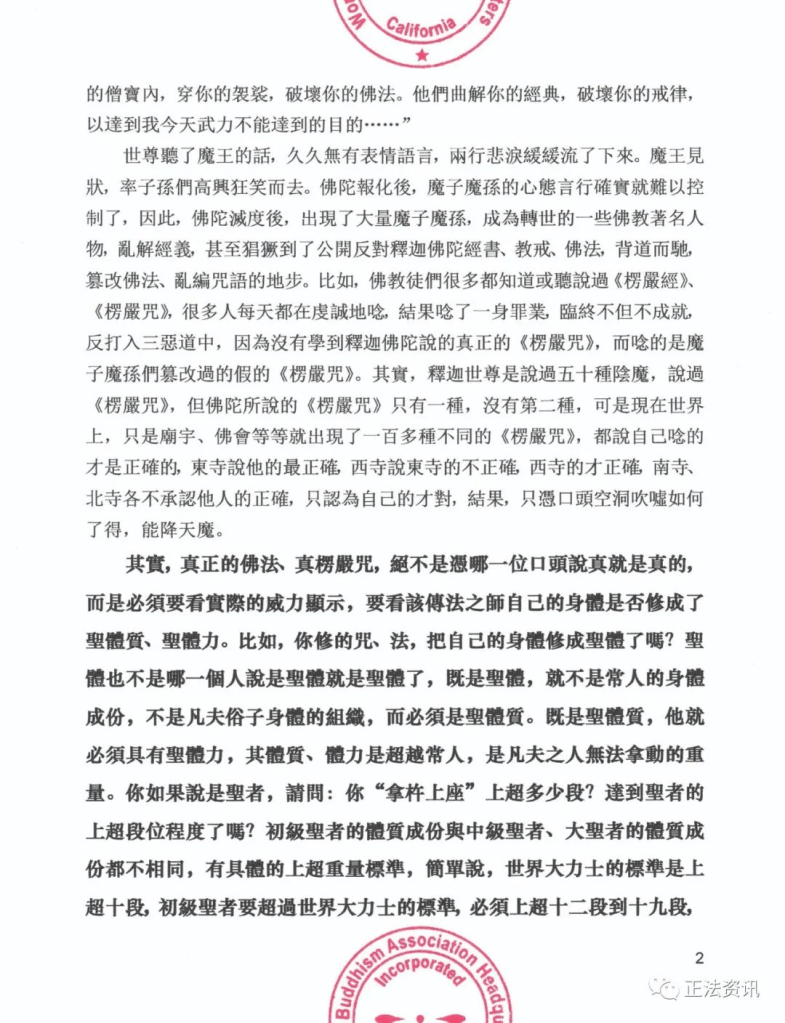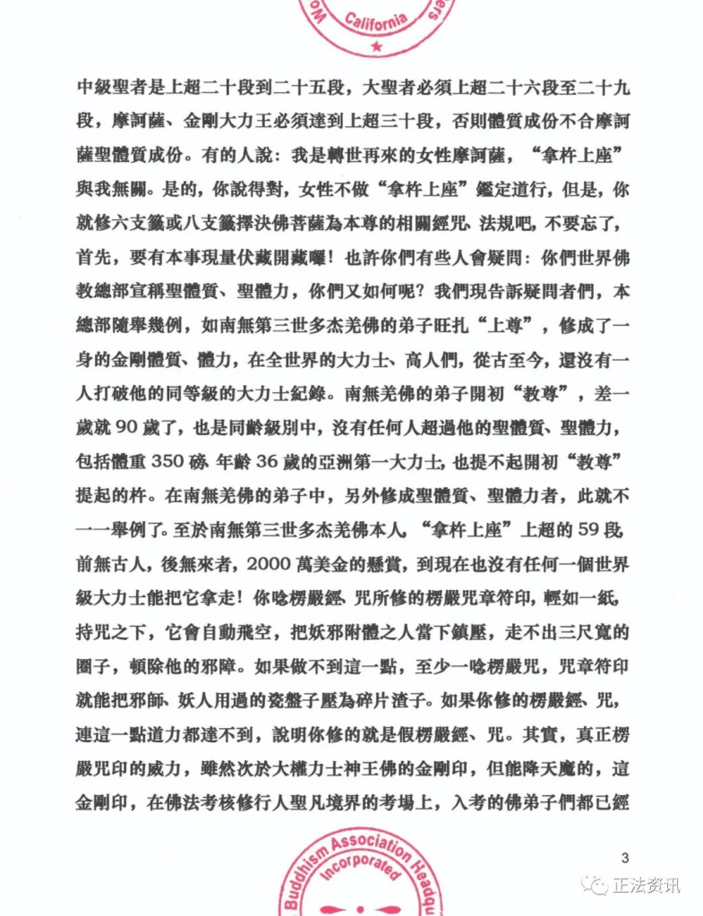 其實,真正的佛法、真楞嚴咒,絕不是憑哪一位口頭說真就是真的,而是必須要看實際的威力顯示,要看該傳法之師自己的身體是否修成了聖體質、聖體力。比如,你修的咒、法,把自己的身體修成聖體了嗎?聖體也不是哪一個人說是聖體就是聖體了,既是聖體,就不是常人的身體成份,不是凡夫俗子身體的組織,而必須是聖體質。既是聖體質,他就必須具有聖體力,其體質、體力是超越常人,是凡夫之人無法拿動的重量。你如果說是聖者,請問:你“拿杵上座”上超多少段?達到聖者的上超段位程度了嗎?初級聖者的體質成份與中級聖者、大聖者的體質成份都不相同,有具體的上超重量標準,簡單說,世界大力士的標準是上超十段,初級聖者要超過世界大力士的標準,必須上超十二段到十九段,中級聖者是上超二十段到二十五段,大聖者必須上超二十六段至二十九段,摩訶薩、金剛大力王必須達到上超三十段,否則體質成份不合摩訶薩聖體質成份。有的人說:我是轉世再來的女性摩訶薩,“拿杵上座”與我無關。是的,你說得對,女性不做“拿杵上座”鑑定道行,但是,你就修六支籤或八支籤擇決佛菩薩為本尊的相關經咒、法規吧,不要忘了,首先,要有本事現量伏藏開藏囉!也許你們有些人會疑問:你們世界佛教總部宣稱聖體質、聖體力,你們又如何呢?我們現告訴疑問者們,本總部隨舉幾例,如南無第三世多杰羌佛的弟子旺扎“上尊”,修成了一身的金剛體質、體力,在全世界的大力士、高人們,從古至今,還沒有一人打破他的同等級的大力士紀錄。南無羌佛的弟子開初“教尊”,差一歲就90歲了,也是同齡級別中,沒有任何人超過他的聖體質、聖體力,包括體重350磅、年齡36歲的亞洲第一大力士,也提不起開初“教尊”提起的杵。在南無羌佛的弟子中,另外修成聖體質、聖體力者,此就不一一舉例了。至於南無第三世多杰羌佛本人,“拿杵上座”上超的59段,前無古人,後無來者,2000萬美金的懸賞,到現在也沒有任何一個世界級大力士能把它拿走!你唸楞嚴經、咒所修的楞嚴咒章符印,輕如一紙,持咒之下,它會自動飛空,把妖邪附體之人當下鎮壓,走不出三尺寬的圈子,頓除他的邪障。如果做不到這一點,至少一唸楞嚴咒,咒章符印就能把邪師、妖人用過的瓷盤子壓為碎片渣子。如果你修的楞嚴經、咒,連這一點道力都達不到,說明你修的就是假楞嚴經、咒。其實,真正楞嚴咒印的威力,雖然次於大權力士神王佛的金剛印,但能降天魔的,這金剛印,在佛法考核修行人聖凡境界的考場上,入考的佛弟子們都已經歷過,只是旺扎“上尊”用的一個金剛印,設立小陣,只有三磅重的金剛印,飛行去來,威力巨大,讓邪魔附體之人寸尺難行,只有悲慘求饒,懺悔過去,改惡向善做好人。這就是釋迦佛陀傳承的真正佛教實相佛法,完全不是口說空洞理論!凡是不顯實相道力的所謂佛法,都是魔子魔孫們篡改過的佛法。