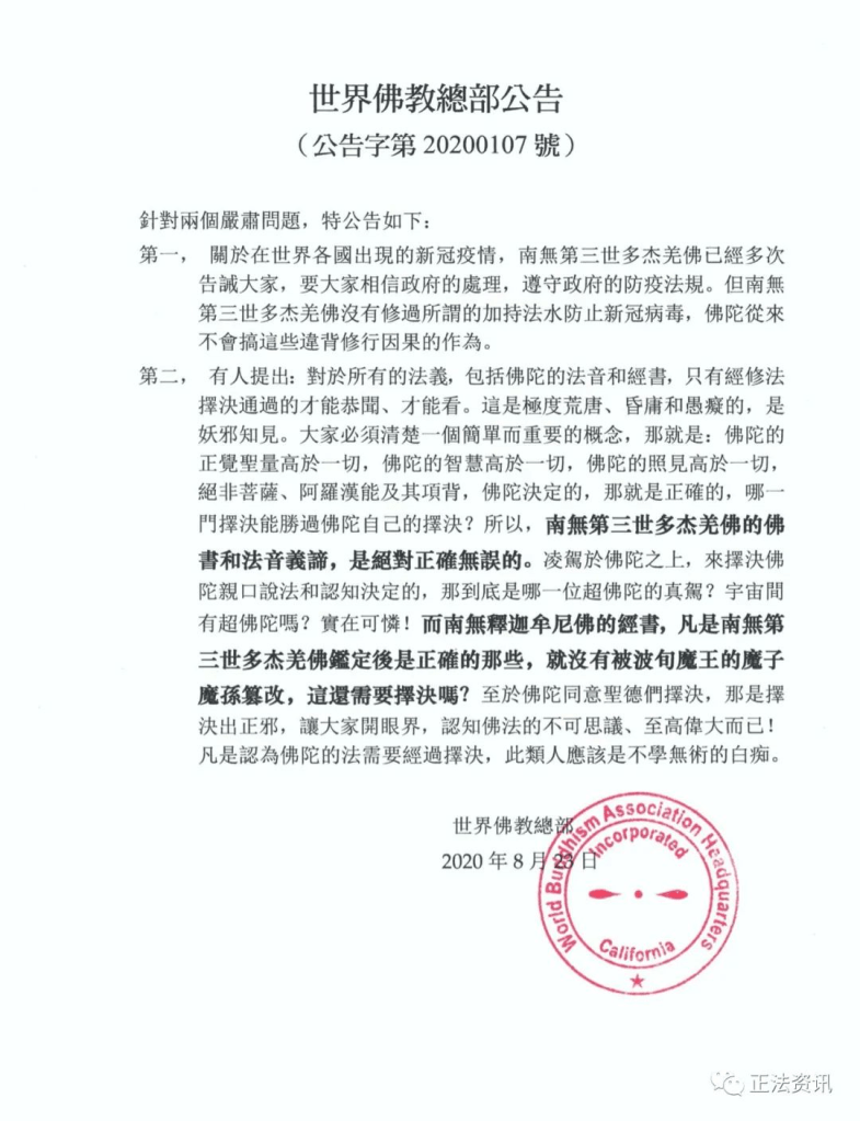 第一,關於在世界各國出現的新冠疫情,南無第三世多杰羌佛已經多次告誡大家,要大家相信政府的處理,遵守政府的防疫法規。但南無第三世多杰羌佛沒有修過所謂的加持法水防止新冠病毒,佛陀從來不會搞這些違背修行因果的作為。