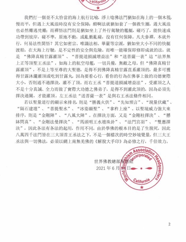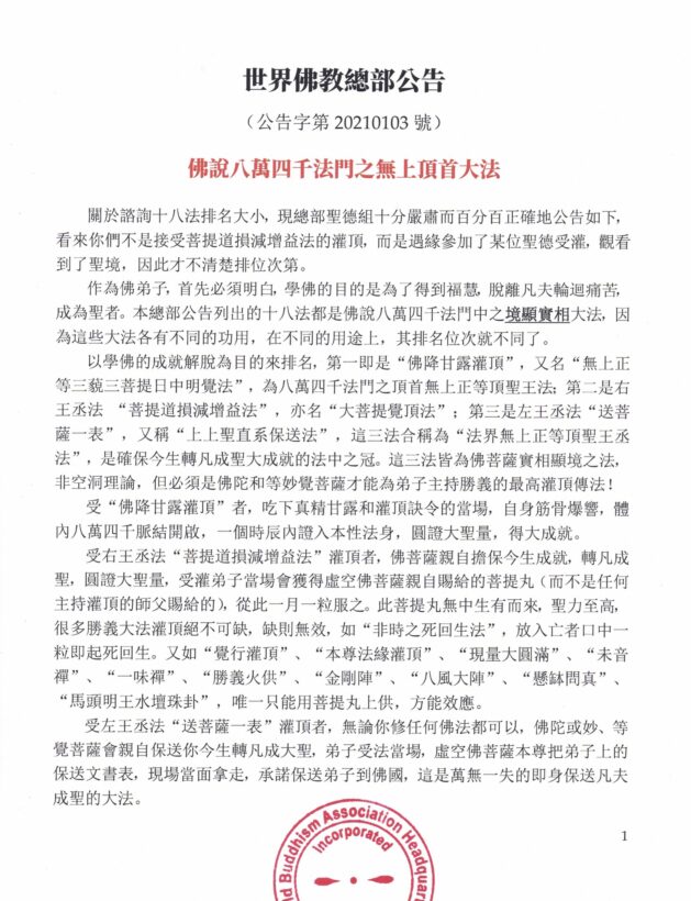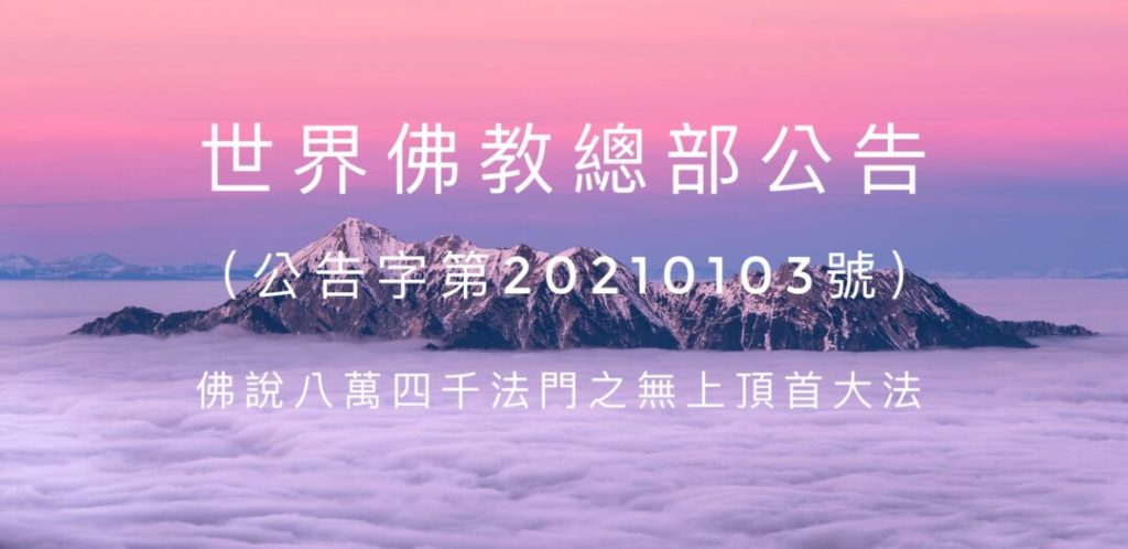 世界佛教總部公告(公告字第20210103號)- 佛說八萬四千法門之無上頂首大法