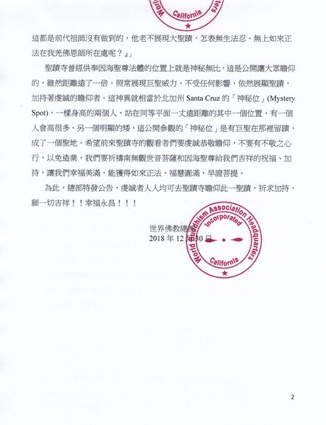 聖蹟寺曾經供奉因海聖尊法體的位置上就是神秘無比,這是公開讓大眾瞻仰的,雖然距離遠了一倍,照常展現巨聖威力,不受任何影響,依然展顯聖蹟,加持著虔誠的瞻仰者。這神異就相當於北加州Santa Cruz的「神秘位」(Mystery Spot),一樣身高的兩個人,站在同等平面一丈遠距離的其中一個位置,有一個人會高很多,另一個明顯的矮,這公開參觀的「神秘位」是有巨聖在那裡留蹟,成了一個聖地。希望前來聖蹟寺的觀看者們要虔誠恭敬瞻仰,不要有不敬之心行,以免造業,我們要祈禱南無觀世音菩薩和因海聖尊給我們吉祥的祝福、加持,讓我們幸福美滿,能獲得如來正法,福慧圓滿,早證菩提。