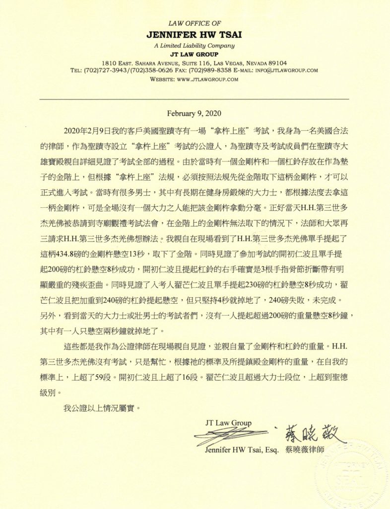 注意,徐蒞達、金豔萍二人在報紙上所登載的聲明中,說南無第三世多杰羌佛拿“鎮殿金剛杵”的重量是420磅,這是根據當時南無羌佛拿杵時,一位出家人說是420磅,當時的新聞稿就這麼寫了重量,但經過律師在現場用幾個不同的秤實際稱量後,得出該“鎮殿金剛杵”的正確的重量是434.8磅,南無第三世多杰羌佛拿杵實際上超了59段,而不是報紙上所說的56段。律師現場公證書附後。
