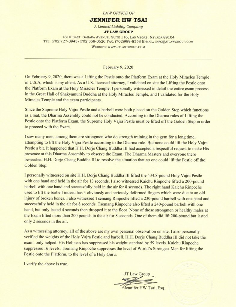 二零二零年二月九日,在美國聖蹟寺大雄寶殿,對佛教徒們“拿杵上座”的證量體質開科考試。當天在大殿考場共有三柄金剛杵,一個槓鈴作為加減重量用,特等“鎮殿金剛杵”重434.8磅,考試槓鈴重280磅,世界大力宗師“拿杵上座”的金剛杵重248磅,孺子杵200磅重。南無第三世多杰羌佛當天被恭請作為最至高尊貴的貴賓出席觀禮,結果被世界佛教總部考試處的聖德們設難逼迫,在大眾再三祈請下,為了考場的開考解危,南無羌佛單手拿“鎮殿金剛杵”離聖座懸空13秒鐘,上超59段。佛陀本質聖力示現,驚天地動鬼神,天龍八部駕臨恭賀,此時突然狂風大作呼嘯,寺廟庭院中容納百人以上的大帳篷和桌椅板凳被全部捲起,三寸多粗的鋼管很多被捲彎折疊,這是從來沒有出現過的,南無第三世多杰羌佛的聖力示現了大地震動這一亙古未有的聖蹟!當天有徐蒞達、金豔萍等近百人員參加考試,現場親見佛陀聖力,同時考場請有律師、記者現場親見公證。徐、金二人為了探求是否除了真正的佛陀拿得起上超59段的“鎮殿金剛杵”外,這世界的另外77億多人中,包括大力士、菩薩等,還有沒有人能拿得起上超59段的“鎮殿金剛杵” ,懸空13秒鐘,為此特懸賞2000萬美金昭告天下,無論什麼人,只要能打破南無羌佛的上超59段的紀錄,就領走他們的獎賞2000萬美金,他們已在加州政府、洛杉磯縣政府作了公證,公開在報紙、網絡上登了聲明啟事和公證書。但至今為止,世界上無有一人能打破南無第三世多杰羌佛的“拿杵上座”紀錄!甚至連中級聖德“教尊”的體質體力都沒有出現過一人。真鋼的聖者是什麼概念?哪裡像你們輕易荒唐地亂加頭銜扣戴桂冠?佛弟子們,你們現在還會相信只會說空話的人嗎?還不應該“三思而行,再思可矣”嗎?