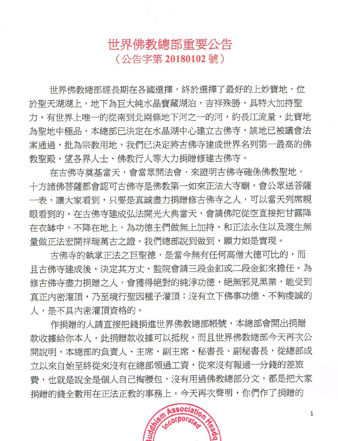 世界佛教總部經長期在各國選擇,終於選擇了最好的上妙寶地,位於聖天湖湖上,地下為巨大純水晶寶藏湖泊,吉祥殊勝,具特大加持聖力,有世界上唯一的從南到北兩條地下河之一的河,約長江流量,此寶地為聖地中極品,本總部已決定在水晶湖中心建立古佛寺, 該地已被議會法案通過,批為宗教用地,我們已決定將古佛寺建成世界名列第一最高的佛教聖殿,望各界人士、 佛教行人等大力捐贈修建古佛寺。