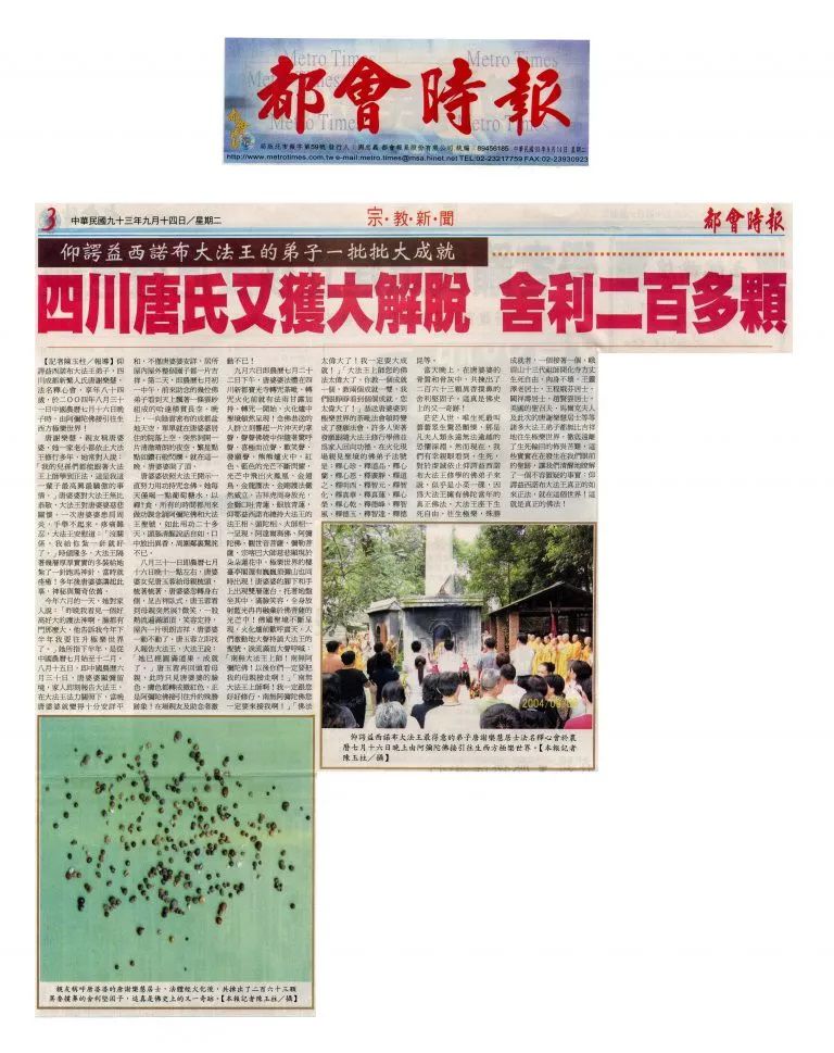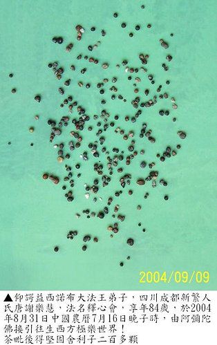 當天晚上,在唐婆婆的骨質和骨灰中,共揀出了二百六十三顆異香撲鼻的舍利堅固子。這真是佛史上的又一奇跡! 茫茫人世,唯生死最叫蕓蕓衆生驚恐顫慄,那是凡夫人類永遠無法逾越的恐懼深淵。然而現在,我們有幸親眼看到,生死,對於虔誠依止仰諤益西諾布大法王修學的佛弟子來說,似乎是小菜一碟,因爲大法王擁有佛陀當年的真正佛法。大法王座下生死自由,往昇極樂,殊勝成就者,一個接著一個,峨眉山十三代祖師開化寺方丈生死自由,肉身不壞,王靈澤老居士、王程娥芬居士、闕祥壽居士、趙賢雲居士、美國的聖召夫、馬爾克夫人及此次的唐謝樂慧居士等等諸多大法王弟子都無比吉祥地往昇極樂世界,徹底遠離了生死輪回的怖畏苦難,這些實實在在發生在我們眼前的聖跡,讓我們清醒地瞭解了一個不容置疑的事實:仰諤益西諾布大法王真正的如來正法,就在這個世界!這就是真正的佛法!