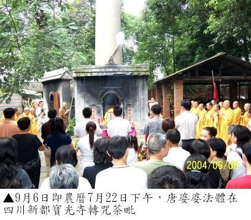 九月六日即農曆七月二十二日下午,唐婆婆法體在四川新都寶光寺轉咒荼毗。轉咒火化前就有法雨甘露加持。轉咒一開始,火化爐中聖境頓然呈現!念佛恭送的人群立刻響起一片沖天的掌聲,聲聲佛號中伴隨著驚呼聲、喜極而泣聲、歡笑聲、發願聲,熊熊爐火中,紅色、藍色的光芒不斷閃耀,光芒中飛出火鳳凰、金翅鳥,金龍護法、金剛護法儼然威立,吉祥虎周身放光,金獅口吐青蓮、眼放青蓮,仰鄂益西諾布總持大法王的法王相、頭陀相、大師相一一呈現,阿達爾瑪佛、阿彌陀佛、觀世音菩薩、彌勒菩薩、宗喀巴大師慈悲顯現於朵朵蓮花中,極樂世界的樓臺亭閣還有巍巍須彌山也同時出現!唐婆婆的腳下和手上出現雙層蓮台,托著她盤坐其中,滿臉笑容,全身放射藍光冉冉融彙於佛菩薩的光芒中!佛國聖境不斷呈現,火化爐前歡呼震天,人們激動地大聲持誦大法王的聖號,淚流滿面大聲呼喊:「南無大法王上師!南無阿彌陀佛!以後你們一定要把我的母親接走啊!」「南無大法王上師啊!我一定跟您好好修行,南無阿彌陀佛您一定要來接我啊!」「佛法太偉大了!我一定要大成就!」「大法王上師您的佛法太偉大了,你教一個成就一個,教兩個成就一雙,我們眼睜睜看到個個成就,您太偉大了!」恭送唐婆婆到極樂世界的荼毗法會頓時變成了發願法會,許多人哭著發願跟隨大法王修行學佛並為家人回向功德。在火化現場親見聖境的佛弟子法號是:釋心珍、釋道品、釋心蘭、釋心恩、釋廣靜、釋道之、釋明西、釋智元、釋智化、釋真華、釋真蓮、釋心榮、釋心乾、釋德峰、釋智風、釋德玉、釋智達、釋德昆等。