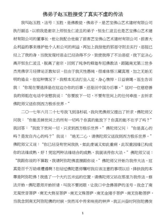 我叫趙玉勝,法號:玉勝,是佛教徒、佛弟子,是藝寶佛山藝術建材有限公司執行副總。以前我是密宗上師恒生仁波且的弟子,恒生仁波且也是藝寶佛山藝術建材有限公司的董事長,他讓我配合他做了損害藝寶佛山藝術建材有限公司、損害大眾利益的事來維護他個人和公司的利益,再加上我按他的邪惡守則去實行,惡報已經上了我的身,當我發現時惡業已經染得不少,致使我得了不治惡症,我下定決心離開恒生仁波且,脫離了密宗,回到了純淨的釋迦牟尼佛教法,跟隨南無第三世多杰羌佛學習經律論正教知識,但由於我天性愚鈍,很難體悟三藏真理,加之無始無明的造業,在這種情況下,我根本無法打坐入定,身心憔悴,日益衰竭。醫生告訴我:“你現在要選擇是在這邊辦你的後事,還是回中國辦後事。” 這時一位元慈悲善良的師姐在電話中安慰我說:“你要放下一切,不要有世間上的任何牽掛,去祈求佛陀師父送你到西方極樂世界。”