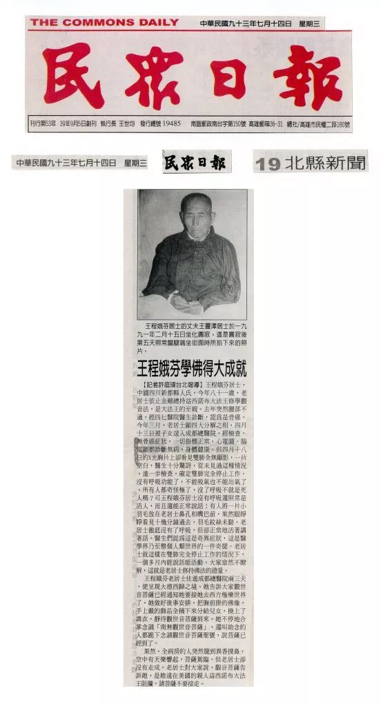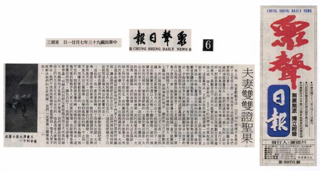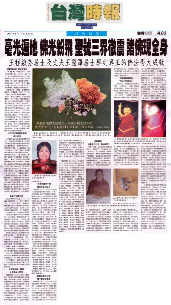 [臺灣時報]毫光遍地 佛光紛飛 聖號三界徹震 諸佛現全身 王程娥芬居士及丈夫王靈澤居士學到真正的佛法得大成就 無呼吸功能 還活著講話