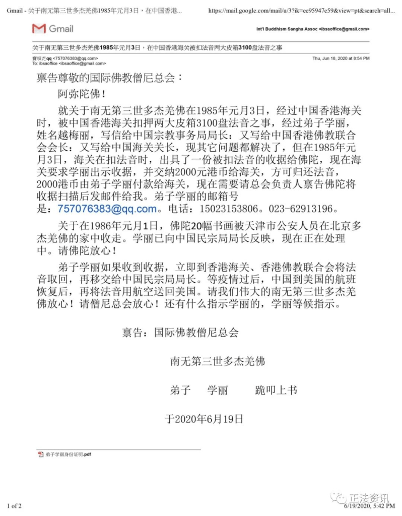 | 這位越梅麗佛教徒:這位越梅麗佛教徒: 國際佛教僧尼總會收到了你的來信(請見上圖)。 首先,我們要指出幾點事實: 一、在1985年前後約十年,南無第三世多杰羌佛從來沒有去過一次香港,也從來沒有在香港海關被沒收、扣押過任何東西,不但在香港海關沒有被沒收任何東西,南無第三世多杰羌佛從小至今,都沒有在全世界任何國家或地區的海關被沒收過任何東西,連一張紙都沒有被沒收過。特別是在1985年,眾生福報還不具足,南無第三世多杰羌佛還只對有緣人說法,但從沒有公開錄過一盤法音,佛教徒們想聽法音都沒有。你不應該以自己想說什麼就說什麼。 二、南無羌佛在中國土地上只有一個房子,是在四川省成都市新華西路,這是佛陀在中國唯一的一個房子。由於南無羌佛被迫害,成都新華西路的房子已經被推為平地,超過十年了,至今沒有償還一分錢,那塊地還空在那裡。除此而外,在整個中國任何其它地方,南無羌佛都沒有任何房產,佛陀在北京連一平方毫米的房子都沒有,所有根本沒有佛陀的書畫“在北京多杰羌佛家中被收走”的事,你不應該無中生有編造一通。 三、南無羌佛的法音和書畫都是公安從堔圳美景大廈拿走的,數量也不是你說的那些,多得太多了。而且美景大廈的房子是喜饒根登仁波且的房產,不是佛陀師父的。 其次,你問到有什麼指示你的,總會這是第一次收到你的來信,總會也不了解你的情況,但是,對所有的佛教徒,總會都要求他們認真恭聞南無第三世多杰羌佛的法音,學習沒有被妖魔篡改過的南無釋迦牟尼佛的經書,嚴守“不殺生、不妄語”等所有戒律,按照南無羌佛和南無釋迦牟尼佛的教導,踏踏實實修行,遵守法律,幫助利益他人和一切眾生,這才是符合一個佛教徒的基本標準。總會對你也是一樣,跟其他人沒有不同。 國際佛教僧尼總會2020年6月19日 |