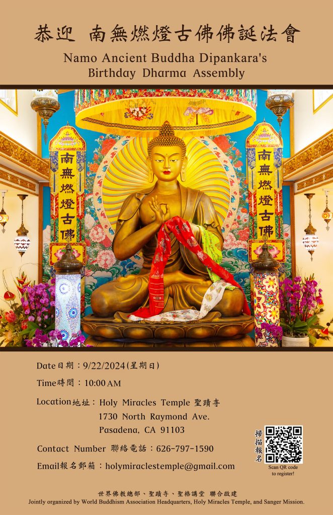 南無燃燈古佛佛誕即將來臨,世界佛教總部(W.B.A.H.)、聖蹟寺(Holy Miracles Temple)、聖格講堂(Sanger Mission )將於2024年9月22日(星期日) 上午10:00 ,在聖蹟寺大雄寶殿聯合啟建南無燃燈古佛佛誕法會,屆時將恭誦《金剛般若波羅蜜經》帶領大眾禮佛拜懺、舉行佛前大供,祈願以此功德恭祝南無燃燈古佛佛誕,為眾生增福增慧,消除一切黑暗,祝禱世界和平,國泰民安。歡迎十方善信踴躍參與,共霑法益!