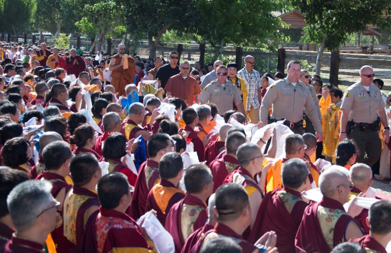 2018年6月24日這天,當這面美國國旗飄揚在加州聖天湖上空時,聖天湖迎來了從世界各地自發雲集而來的數千名佛教人物,大部分都是佛教的法師和宗教導師,“向南無第三世多杰羌佛祝壽”大法會在這裏舉行。佛教徒們跪在地上,手捧哈達,等待南無第三世多杰羌佛聖駕莅臨。下午五點左右,先有指揮車、防彈車開進了聖天湖,車上有全副武裝手提衝鋒槍的衛士,南無第三世多杰羌佛終於出現了!祂在眾多警察的護衛下,在反恐隊長指揮的反恐便衣人員的多重防衛環繞中,走上了紅地毯。所有佛教徒不停高呼“南無第三世多杰羌佛!”