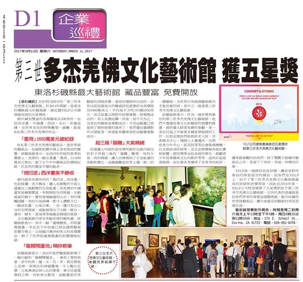 本文連結: 新聞熱烈報導:第三世多杰羌佛文化藝術館榮獲美國YELP網站頒發頂級五星獎狀!