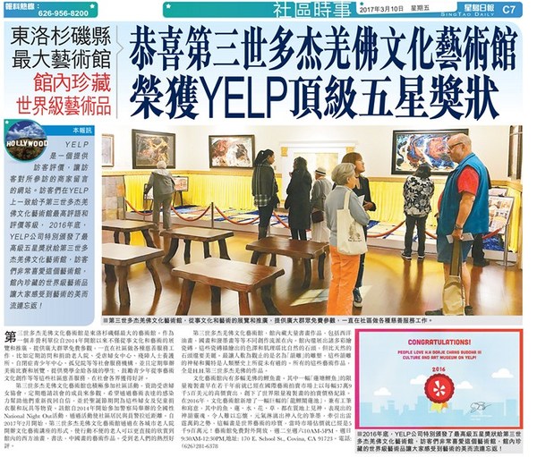 新聞熱烈報導:第三世多杰羌佛文化藝術館榮獲美國YELP網站頒發頂級五星獎狀!