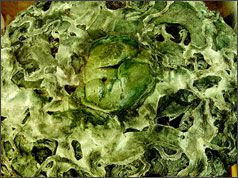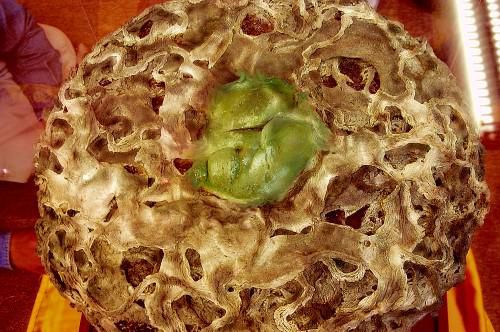 圖為藤蘿法帳頂,藤蘿瞬間呈顯數百年的枯竭乾老的「無常」相,圖中央為大法王手印覆蓋下的藤蘿,不僅沒有乾枯,手印濕苔仍活鮮如新。(隆智攝)