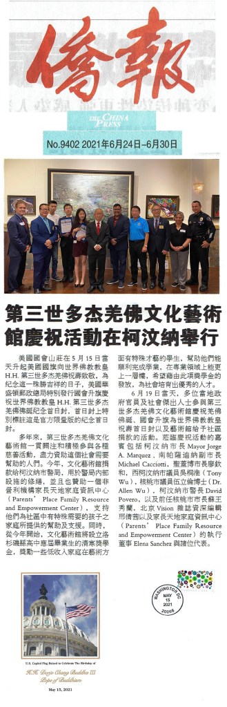 6月19日當天,多位當地政府官員及社會傑出人士參與第三世多杰羌佛文化藝術館慶祝羌佛佛誕、國會升旗為世界佛教教皇祝壽首日封以及藝術館給予社區捐款的活動。蒞臨慶祝活動的嘉賓包括柯汶納市長 Mayor Jorge A. Marquez, 南帕薩迪納副市長 Michael Cacciotti,聖蓋博市長廖欽和,西柯汶納市議員吳桐淮(Tony Wu),核桃市議員伍立倫博士(Dr. Allen Wu),柯汶納市警長 David Povero,以及前任核桃市市長蘇王秀蘭,北京 Vision 雜誌資深編輯邢倩茜以及家長天地家庭資訊中心(Parents’ Place Family Resource and Empowerment Center)的執行董事 Elena Sanchez 與諸位代表。