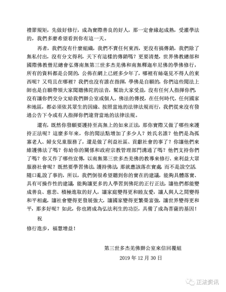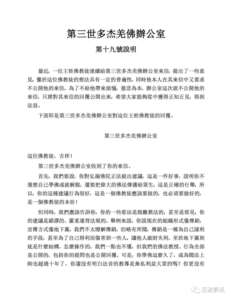 下面即是第三世多杰羌佛辦公室對這位王姓佛教徒的回覆。