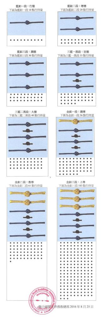 如果你想真正了解到一個為師者的成就大小是什麼等級,就必須要從考試的段位來確定,要看為師者的段位釦裝,這才是檢測道行高低的試金石,而且是百分之一百的準確,沒有半分毫的差錯,正因為如此確定,所以八風陣入門口的楹聯才敢於立下『有幾兩就幾兩,莫圖加兩,是一段顯一段,休想升段』。現在已經徹底證實了這幅楹聯的精確性,證明了聖考是不會有半分毫差錯的!!!因為至今為止,已經有考過書面題中、三分之一的一百多位上師、法師、阿闍黎、活佛、法王、尊者、經歷了八風陣聖考,他們都是從幾十萬學佛修行人中選拔突出的精英,個個都想拿到金釦,結果在這幾十萬人中冒尖的一百多位精英裡,考上金釦一段的人只有百分之二,估計餘下更多下一步要入考的人,今後成績會更差,原因是重要的人物基本上都考完了,而且大家都是在公眾同場同等條件下入考的,相互監看著,誰想丟臉?誰不想考上金釦呢?誰願意在公眾同道面前低人一等呢?他們都施展了畢生功夫,拿出了全部家當道行,可是毫無辦法,最終還是如楹聯所定「休想升段」,大家基本上都是在進考藍釦二段時就被八風捲入輪迴界中,動彈不得了,能考上藍釦二、三段已經很不簡單,就是考上藍釦一段,基本上二至三千個學佛修行人中才有一個。更值得一提的是,入聖考的為師者,他們考到的段位與他們的經律論百題書面答卷,基本上成績都是在一條同等線上,而且所考的段位,一定是百分之百與未考之前入考人自己在暗地裡打的文殊菩薩卦是相符合,不差分毫的,(1)書面答卷考題、(2)自己打卦、(3)進八風陣聖考段位,這三部考證能統一在一個標準數據上,說明了什麼?這說明了確實是什麼程度就是什麼程度,低不了也高不了,有幾兩就幾兩,冒稱不了的,精確得很,只有不看公告的人,活該倒楣被騙,我總部不該說這話,但不說也是事實,莫如說了提醒大家會更好一些。」 具有6至10點行持量,就可以考上藍釦一段,也就是說每考一段至少要6點,最多用10點,就可以考過每一段,所以藍釦二段必須具有16至20點行持量,藍釦三段必須具有26至30點行持量,為什麼是多少點至多少,而不是確定性的行持量?因為上一段只要入考人具有6點行持量,就會考過藍釦一段,如果只有5點,就不會通過了,要考上藍釦二段,必須具備16至20點行持量,為什麼?原因是上一段必須用去了10點行持量,考二段時必須扣除上一段所考的最多的10個點,因為每一段完整的行持量是10個點,並不是6個點,只能說到6個點就進入錄取了,如果前面是用6個或7個、8個、9個點考上的,說明此人擁有的點不到10個點,後面考二段時就一個點也沒有餘下了,所以必須要有16點才能考上二段,考三段同前面的理法,必須扣除一段和二段共20個行持點,最後至少還餘下6個點才能考上三段,藍釦三段可進入考金釦一段,如果打破結界,走進平安樂地,又被八風捲出的,鑒於沾上了一點樂地的土,獲得黑釦一枚,是5點行持量,因為每一枚黑釦是5點行持量,此段位稱為三藍一黑段。凡是考上金釦一段的,袍裝上必須戴了三枚藍釦、二枚黑釦、一枚金釦。金釦一段必須總共要有56點行持量才考得過關,金釦一段進入阿羅漢和菩薩道行了。在56點行持量的金釦基礎上,只要另外還有多餘的5點行持量,成為61點行持量,即是金釦二段的道行,金釦一段到二段的行持量差距是很小的,只多了5個點,雖然只多了5個點而已,但很難得到,這就猶如舉重到了極限時,多加一公斤也是加不上去的,所以,聖考道行是十分精準的,但是金釦二段到金釦三段的行持量就完全不同了,差距非常之大,必須要具有183點行持量,才能考上金釦三段,金釦三段的道行便證到了大菩薩,進入不退地,金釦四段、金釦五段不用說,那道行高到不可思議了,因為是等妙覺菩薩是不用八風陣考的,只要看祂們的隔石建壇或先知預言道行,或者用金剛法幔對祂們實行擇決,就百分之百正確了,可惜這些真正的等妙覺菩薩,目前一個也沒有出來弘法,大概是眾生的法緣關係吧!乃至金釦三段的上尊和二段的教尊,在全世界也只有旺扎上尊和莫知教尊在顯境利生,包括拙火功夫強盛金釦一段的開初孺尊,和良馬空行金釦一段的孺尊,也沒有出來弘法,目前為止在所有入考人中,除了莫知教尊之外,還沒有人在聖考陣中考過關金釦二段,對當今末法時期的某些大法王、大活佛、大法師,要考上金釦二段萬分之一的可能都難,更況三段!所以凡是真正的大菩薩,必須、而且一定是具有183點行持量的金釦三段,而凡是聖者阿羅漢、菩薩的聖量成份(登地菩薩)又必須具有56點行持量,否則就是假的阿羅漢、假菩薩的成份,凡是冒稱者,一律皆是騙子無疑!!!! 至於要考「金剛陣」的報考者,只接受道行聖量自己報是阿羅漢或菩薩的轉世者來入考,或者是已經考過關藍釦三段的潤德可以入考,除此之外,不接受其他任何單獨條項入考,因為「金剛陣」只從聖量深淺、道行高低來錄取真正的聖德。 為了行人們識別段位袍裝,識別為師者是哪一段的德人,以下特用圖檔標示,而每一段的行持量點數,將以滿分點數做圖案,比如6~10點,我們就只取滿分的10點行持量來標示在本公告中,而在穿著的衣裝上,只標示藍釦或金釦段位,不會標示行持量的點數,須從公告圖檔上,核實對應衣裝上的段位,就知道有多少點行持量了: