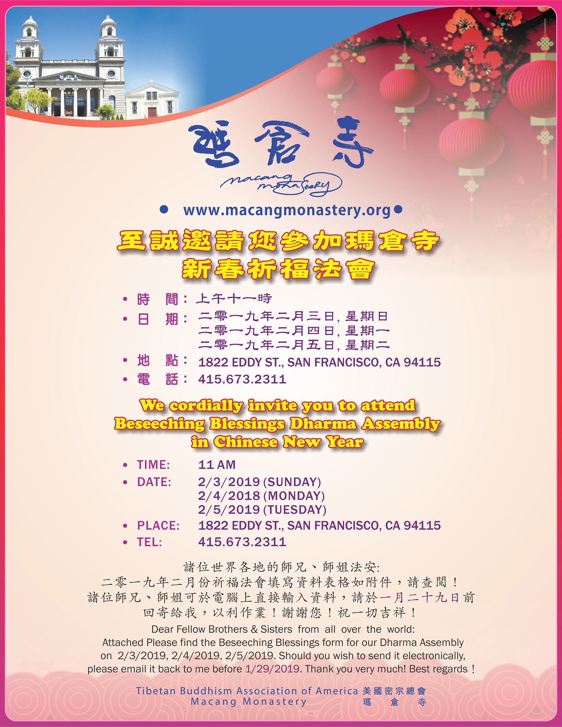 舊金山瑪倉寺二月新春祈福法會邀請 2019-01-29 法會活動通知 分享此文: 按一下即可分享至 X(在新視窗中開啟) X 按一下以分享至 Facebook(在新視窗中開啟) Facebook 喜歡 正在載入...