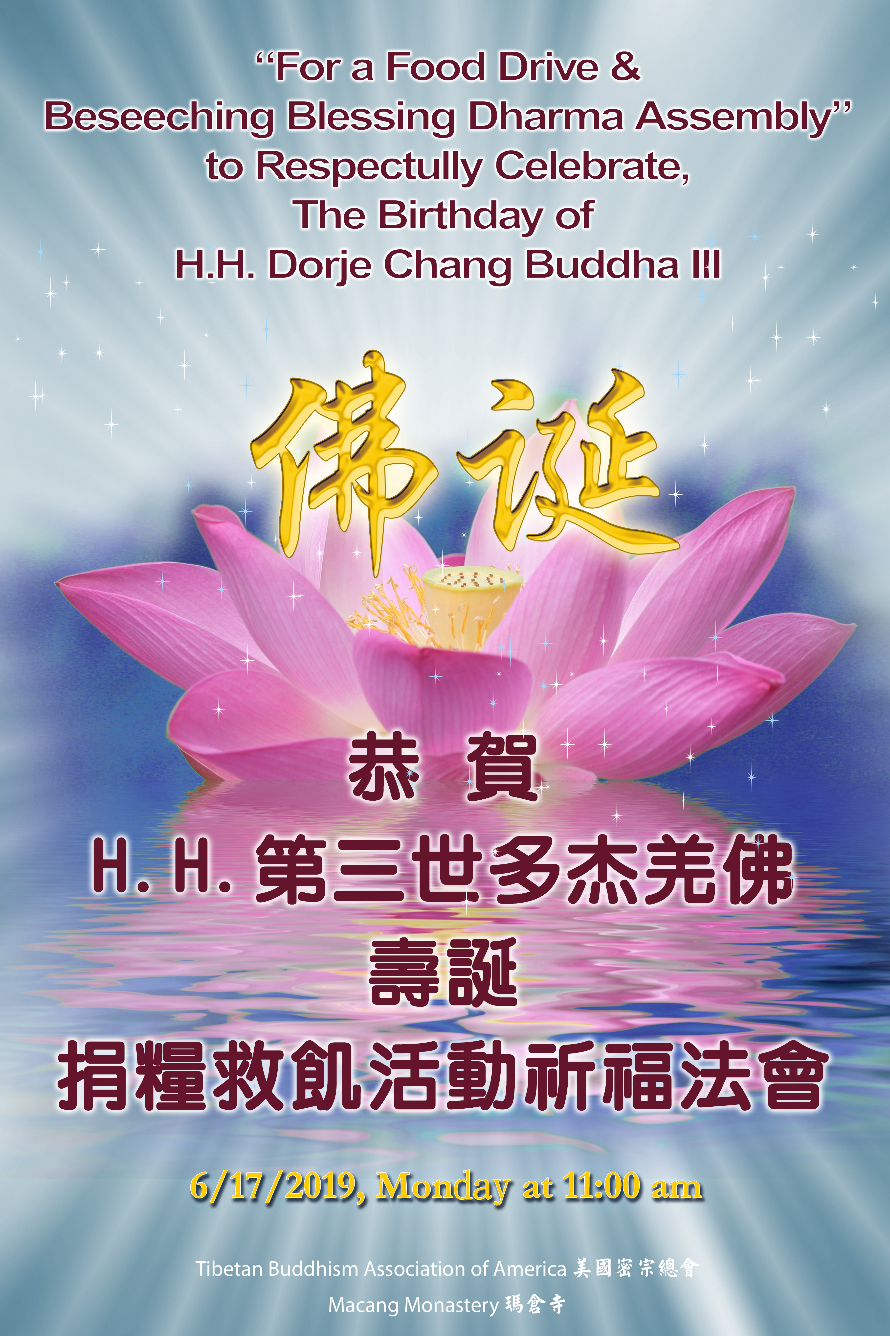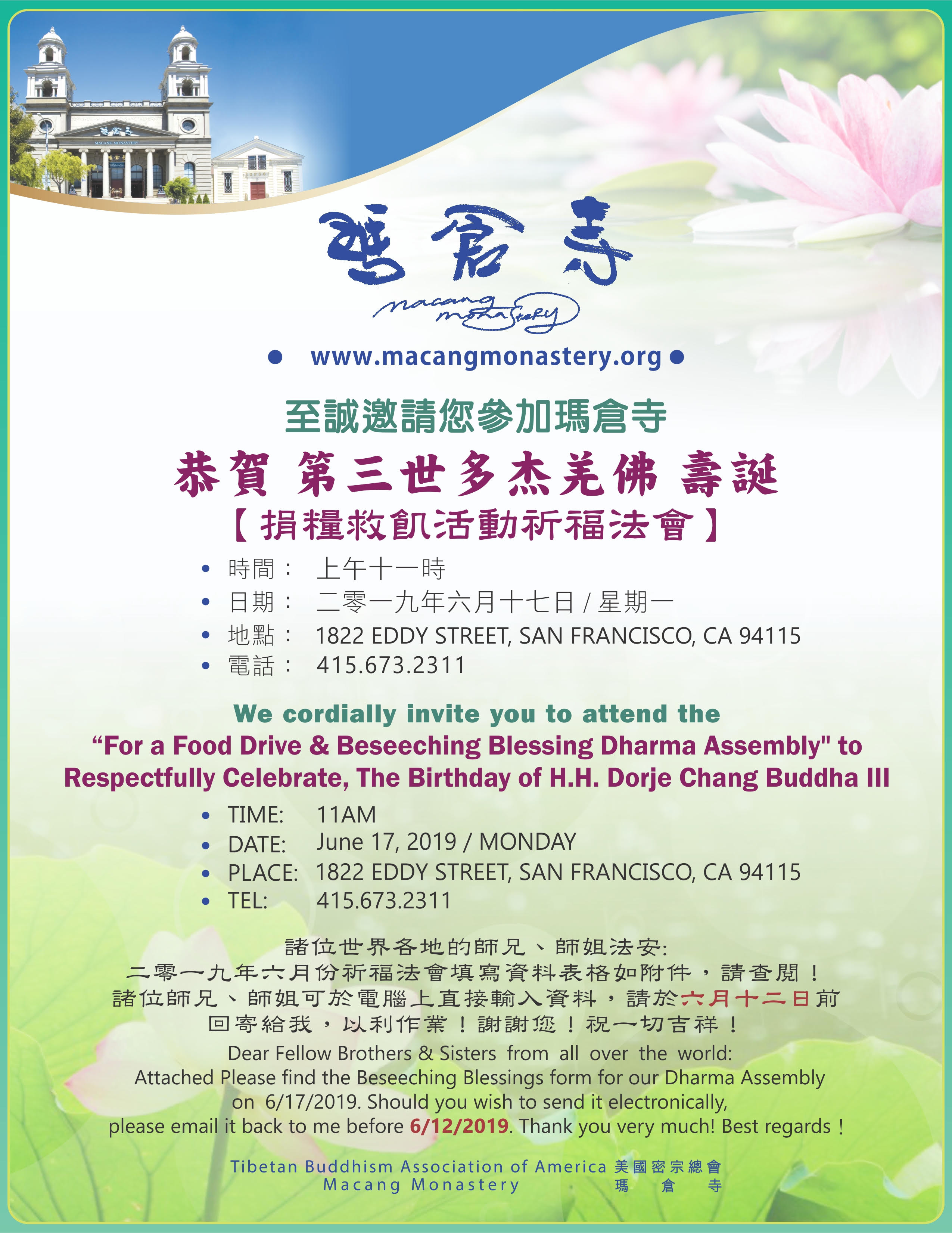 舊金山瑪倉寺六月份恭賀第三世多杰羌佛壽誕捐糧救飢活動祈福法會邀請