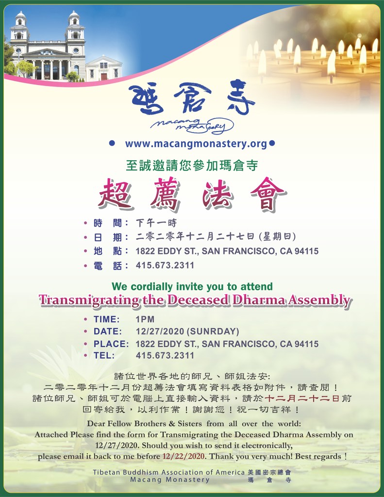 舊金山瑪倉寺十二月份超薦法會邀請 2020-12-3 法會活動通知 本文連結網址: 舊金山瑪倉寺超薦法會邀請 舊金山瑪倉寺十二月份超薦法會邀請 H.H. 第三世多杰羌佛 http://www.hhdcb3office.org瑪倉寺 http://www.macangmonastery.org瑪倉文教基金會 http://www.macangfoundation.org 分享此文: 按一下即可分享至 X(在新視窗中開啟) X 按一下以分享至 Facebook(在新視窗中開啟) Facebook 喜歡 正在載入...