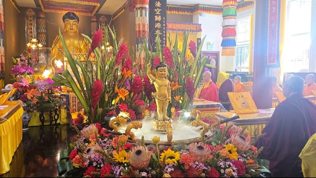 【舊金山訊】舊金山華藏寺於5月4日(星期日),隆重舉辦「南無釋迦牟尼佛佛誕浴佛法會」,法會由世界佛教總部、華藏寺及聖格講堂聯合主辦,華藏寺住持金釦一段聖德若慧孺尊擔任主法。有來自舊金山灣區,美國各州及國籍來自印度、緬甸、德國等國的佛教善信蒞寺參加。浴佛法會隆重莊嚴,大眾齊聚華藏寺共同紀念南無釋迦牟尼佛佛誕。