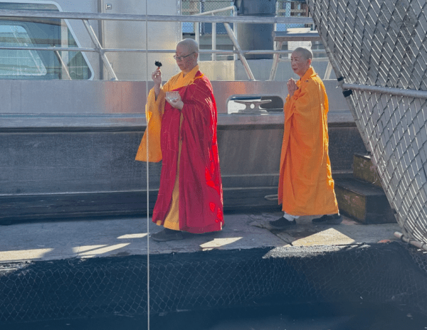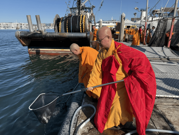 同日,北加州舊金山華藏寺的信眾們,齊聚聖拉菲爾(San Rafael)海岸,恭誦《心經》與《大悲咒》,放生魚群,祈願世界和平、災難止息。來自墨西哥的信眾 Ayduri Cupul 表示:「我非常喜歡這項活動。它讓人感到平靜,也讓我感受到更充沛的生命力與內心的安定。」
