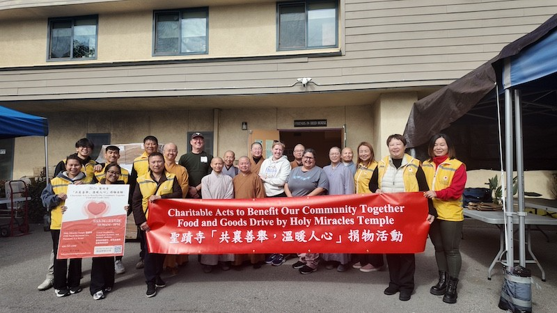 為了確保物資能發揮最大效益,寺方在賑濟行動前便與各受贈單位深度溝通,精確掌握其當前的匱乏清單,確保大眾的善心能與實際需求無縫對接。在此次行動中,針對服務帕薩迪納市超過百年的 Friends In Deed 食物銀行,募集了大量的罐頭、乾糧與禦寒物資,直接緩解了冬季食物銀行的高峰需求,為當地貧困家庭與無家可歸者構築起穩固的社會防護支援網。食物銀行部門主任 Tim Nistler受訪時表示:聖蹟寺與聖格講堂今年是第三年為我們送來大量的食物捐䁬與莫大的祝福。這些食物,讓我們的工作更加順利,也讓來領取食物的700多個家庭能帶著充足的糧食回家,我謹代表向你們表達最誠摯的感謝。