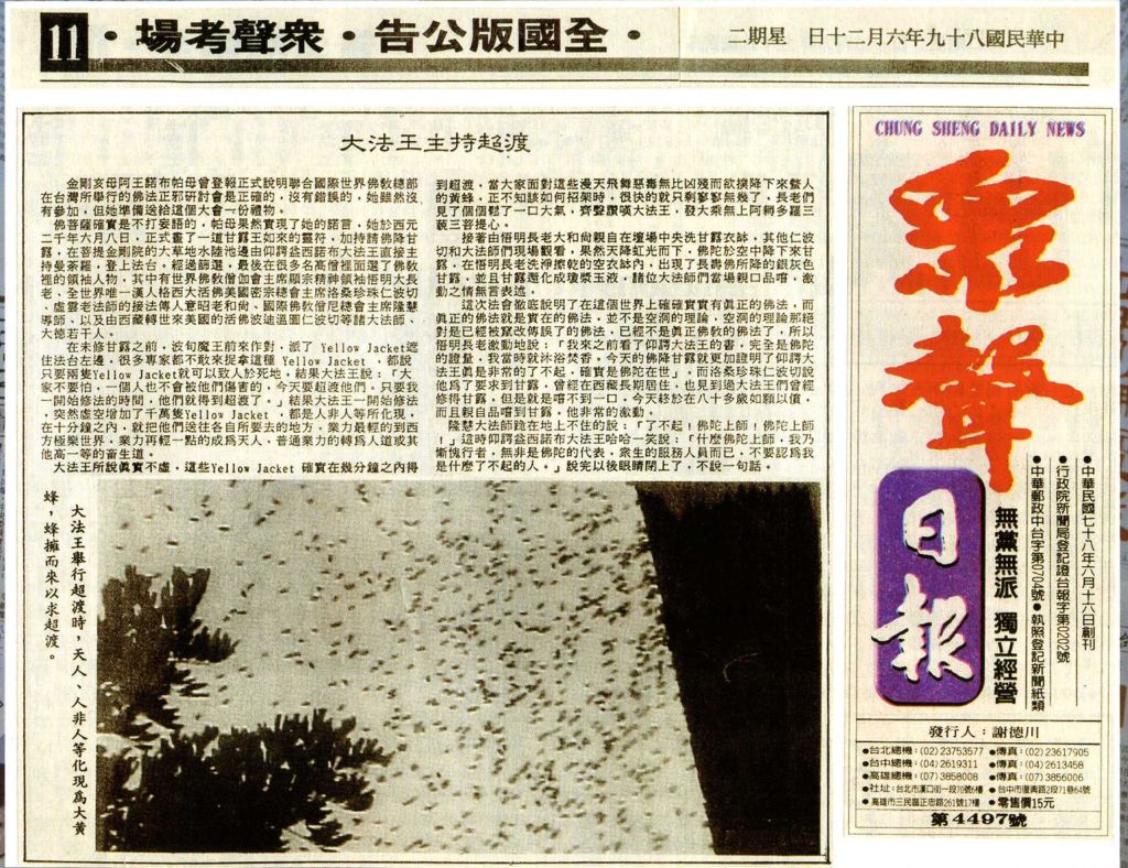 大法王(H.H.第三世多杰羌佛)所說真實不虛,這些Yellow Jacket確實在幾分鐘之內得到超渡,當大家面對這些漫天飛舞惡毒無比兇殘而欲撲降下來螫人的黃蜂,正不知該如何招架時,很快的就只剩寥寥無幾了,長老們見了個個鬆了一口大氣,齊聲讚嘆大法王,發大乘無上阿耨多羅三藐三菩提心。