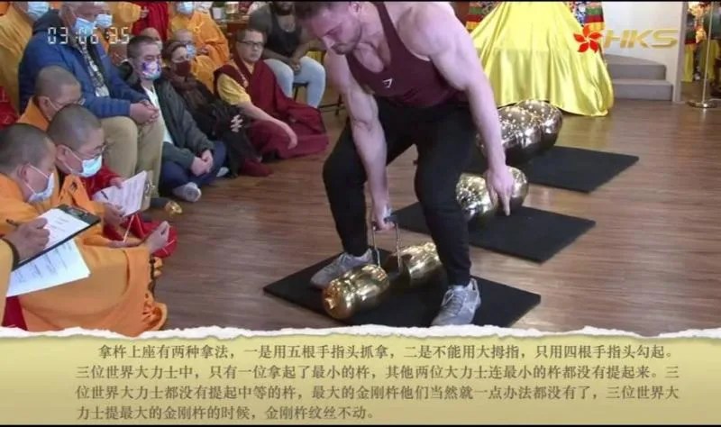 根據世界佛教總部副主席聖德釋證達教尊表示,她當時在現場坐在視野最佳的位子上,聖蹟寺大殿中央放有三把杵,最小的孺子金剛杵、中型的法門金剛杵和世界獨一無二的巨無霸金剛大杵,這把巨杵就是原本H.H.第三世多杰羌佛曾經單手抓握懸空的巨杵,由於兩端更換了大螺帽,重量由原本的434.8磅變成了437.2磅。三位大力士中JoshuaYancey單手抓握把最小的孺子金剛杵提起來懸空了8.66秒鐘,用4根手指頭勾提起了孺子杵懸空了5.44秒鐘,展示了世界大力士的威力,超過了他自己的康體士段位,但是JoshuaYancey抓拿中型的法門金剛杵紋絲不動,失敗了,抓拿巨杵照常是紋絲不動。至於另外兩位大DanielSimon和TrentMiller,施展渾身解數,最終連最小的那把孺子金剛杵也沒有提起來,失敗告終。