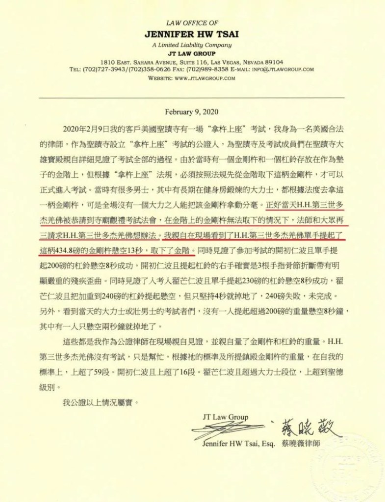 2020年2月9日,在美國洛杉磯的聖蹟寺舉行了一場”拿杵上座”檢測考試,H.H.第三世多杰羌佛很多人一起在現場見證拿杵上座檢測過程,現場並由律師全程見證簽名。在蔡曉薇律師的公證文(圖二)中得知,當時,H.H.第三世多杰羌佛被恭請到考場觀禮,為了幫助主辦單位考試順利進行,H.H.第三世多杰羌佛在聖蹟寺眾目睽睽之下,單手抓握把重達434.8磅的“鎮殿金剛杵”從金階提起,把聖座懸空,懸空時間超過法定的13秒。