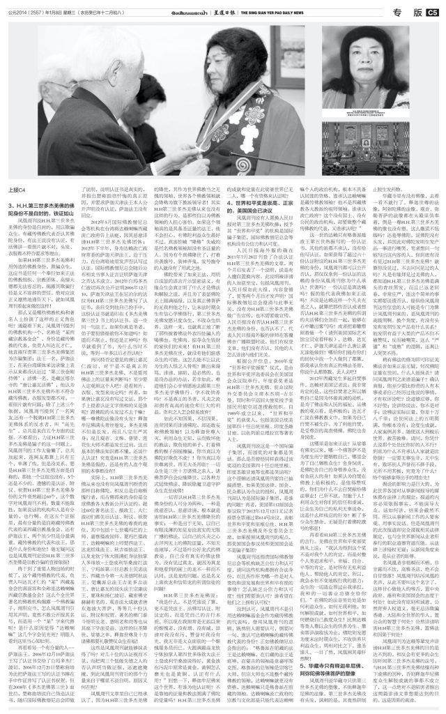 - 一篇針對著名人物、重大事件的披露,作者是隱身人,而且內容虛假、謊言充斥、言語低俗、邏輯混亂,所有的指責認真起來都無法成立,可以說不堪一擊。該文毫無疑問會引起質疑,而且從法律上在任何國家都可以認定侵權無疑!鳳凰週刊對如此嚴重後果棄之不顧,不惜毀掉累積多年的聲譽也要抹黑H.H.第三世多杰羌佛,這不符合媒體運作的常理!鳳凰週刊顯然身負巨大壓力,或者被巨大的利益驅動,無論是哪一樣,都有背後的力量在推動這件事一一一不惜代價來做一件肯定蝕本的買賣一一一敗壞H.H.第三世多杰羌佛的聲譽!是誰在背後以及如是做的緣由,行文中讀者自會發現。