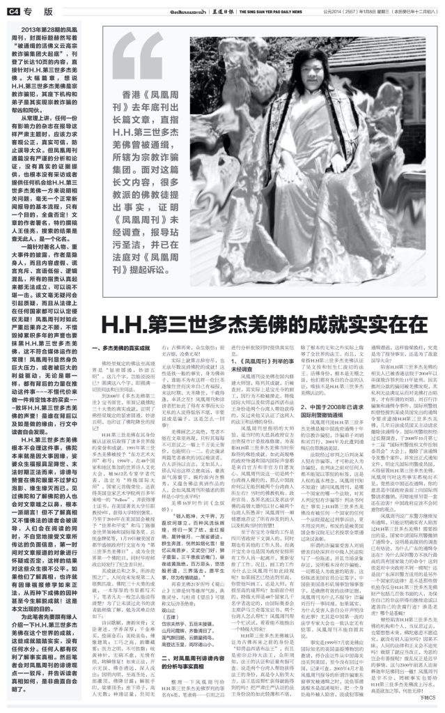 香港《鳳凰週刊》去年底刊出長篇文章,直指H.H.第三世多杰羌佛曾被通緝,所轄為宗教詐騙集團。面對這篇長文內容,很多教派的佛教徒提出事實,證明《鳳凰週刊》未經過調查,報導玷污聖潔,並已在法庭對《鳳凰週刊》提起訴訟。