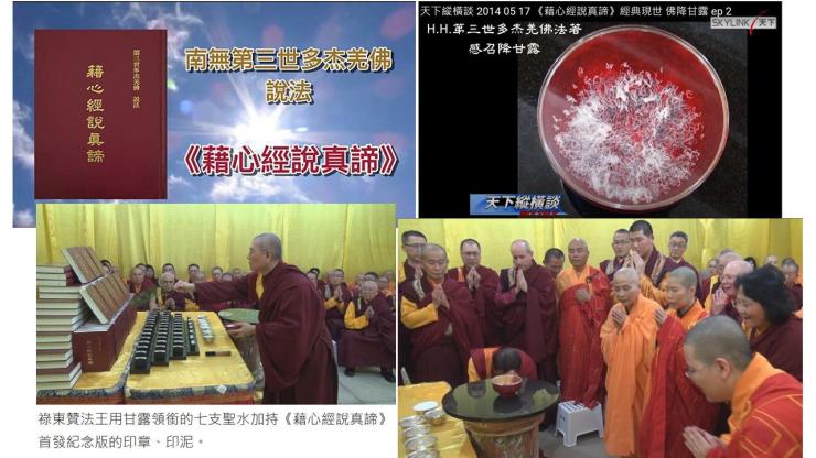 二○一四年三月七日,在美國聖蹟寺舉行《六部法水匯聚法會》,來加持南無第三世多杰羌佛說法的《藉心經說真諦》首發式的印章、印泥,法會主壇者祿東贊慈仁嘉措法王特地親自從H.H.第三世多杰羌佛那裡請來紫金銅缽匯聚法水,參加該加持法會者全都是仁波切、法師、阿闍黎,法會中大家十分虔誠地開始進入了念誦六字大明咒和心經。
