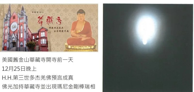 圖﹕美國舊金山華藏寺開寺前一天12月25日晚上H.H.第三世多杰羌佛預言成真,佛光加持並出現瑪尼金剛棒瑞相