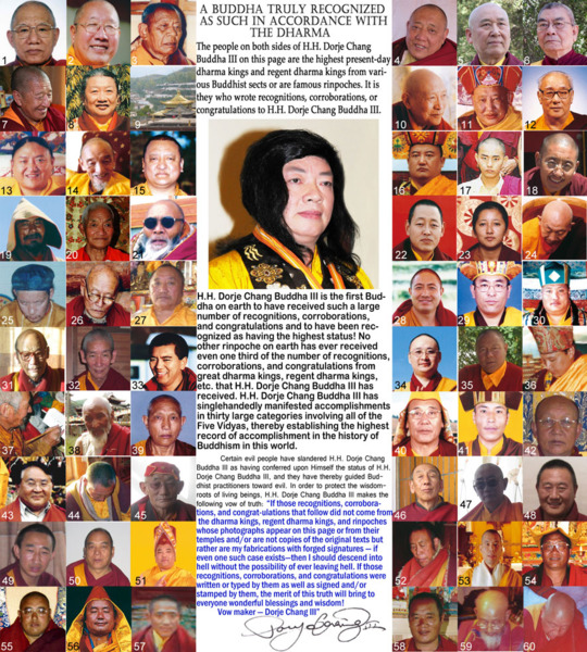 2. H.H. Dorje Chang Buddha III is a true Buddha who has been recognized as such by leaders, regent dharma kings, and rinpoches of various Buddhist sects all over the world in accordance with the more than 1,000-year-old Buddhist recognition system. His Holiness the Buddha is also the only one in the history of Buddhism to have received such a large number of recognitions. The status recognized was not that of a rinpoche; rather, it was that of a Buddha. In Buddhism, no great Bodhisattva, great patriarch, or great dharma king is above a Buddha. A Buddha is the highest leader of all of Buddhism. Moreover, the accomplishments of H.H. Dorje Chang Buddha III in the Five Vidyas are foremost in the history of Buddhism. No prior holy ones have comparable accomplishments. Such accomplishments of H.H. Dorje Chang Buddha III surpass the requirements prescribed by Namo Sakyamuni Buddha in the sutras. A Buddha does not have the perspective of a patriarch of a certain sect or school. Rather, a Buddha has the perspective of the entirety of Buddhism, just as Namo Sakyamuni Buddha had. A Buddha is the highest one upon whom all Buddhists rely and from whom all Buddhists learn!