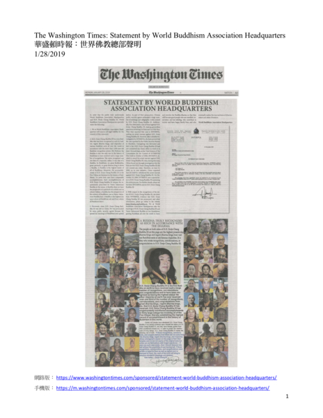 Washington Times–Statement by World Buddhism Association Headquarters (1-28-2019) 華盛頓時報–世界佛教總部聲明